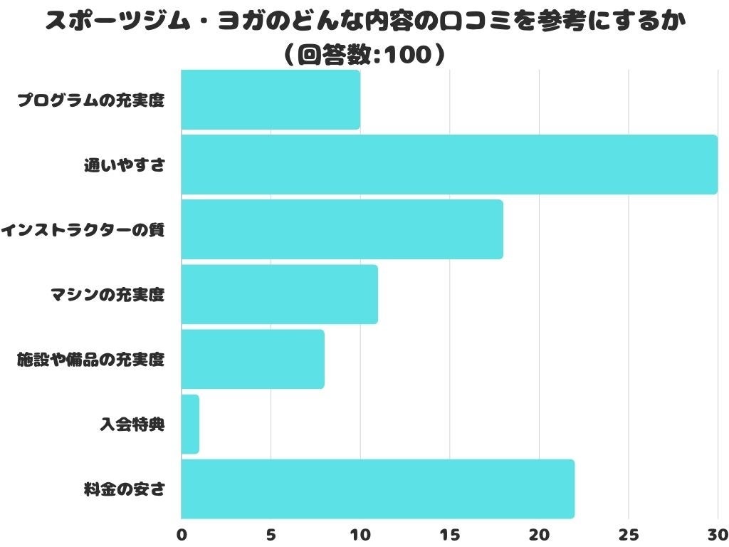 スポーツジム・ヨガのどんな内容の口コミを参考にするかをアンケートにて調査したところ、1位は「通いやすさ」でした。