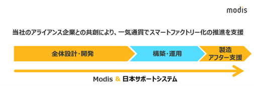 その一方で、スマートファクトリーへの転換は容易ではなく、具体的な施策への着手等に際し、課題を抱えている企業が多くあります。弊社ではそうした企業に対し、課題を抽出、分析のうえ解決施策を実施する独自の課題解決サービス「バリューチェーン・イノベーター」※を通じて、企業におけるスマートファクトリー化に向けた全体構想の設計・開発を行います。さらに、工場の構築・運用では、提携企業でロボットシステムインテグレーターである日本サポートシステム社と連携、製造・アフター支援の工程では、Modisがスマートファクトリー化した工場で就業する人財を提供する等、一気通貫した支援を行うことが可能になります。