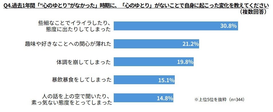Q1で「“心のゆとり”がなかった」と答えた方に、「心のゆとり」がないことで生じるネガティブな変化を聞いてみました。「些細なことでイライラしたり、態度に出たりしてしまった」(30.8%)が最も高く、「趣味や好きなことへの関心が薄れた」(21.2%)、「体調を崩してしまった」(19.8%)など、「心のゆとり」の有無が心身に影響を及ぼしていることが明らかになりました。