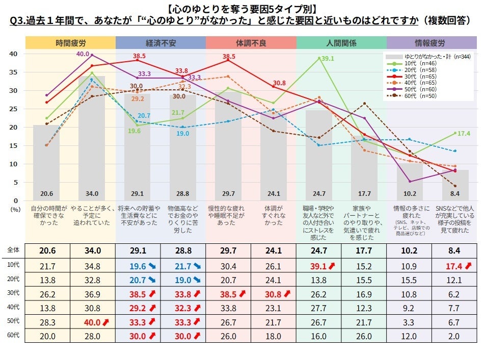 Q1で、「“心のゆとり”がなかった」と答えた方に、過去1年間で自身が「“心のゆとり”がなかった」と感じた要因を聞きました。その結果、「心のゆとり」を奪う要因は、以下の5タイプに分類され、年代ごとに異なる傾向が明らかになりました。