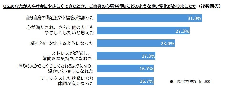 Q2で過去1年間を振り返り人や社会に「やさしくできた」と回答した方に、そのときの自身の心境について聞きました。「自分自身の満足度や幸福感が高まった」(31.0%)「心が満たされ、さらに他の人にもやさしくしたいと思えた」(27.3%)といった変化を感じていることが分かりました。 「やさしさ」と「心のゆとり」は互いに影響し合い、さらに次の「やさしさ」を生む可能性があることが示唆されます。