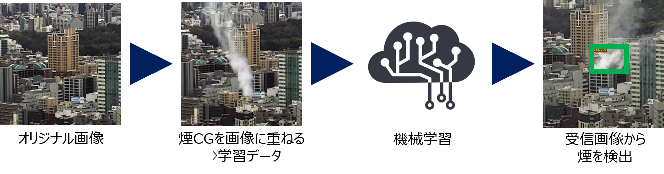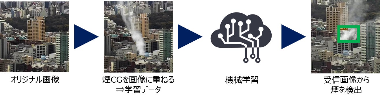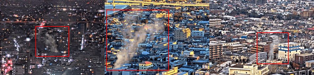 AIの精度向上のため、本サービスでは株式会社理経(東京都新宿区西新宿三丁目/代表取締役社長 猪坂 哲)との協業によりCGを使った煙の画像をAI学習に用いています。火災発生時の煙は十分なデータがなく、天候や時間帯によっても色・形状が異なるため、天候・時間帯に合わせたCG学習データを準備し、機械学習を行うことで、より精度の高いAIの開発に成功しました。