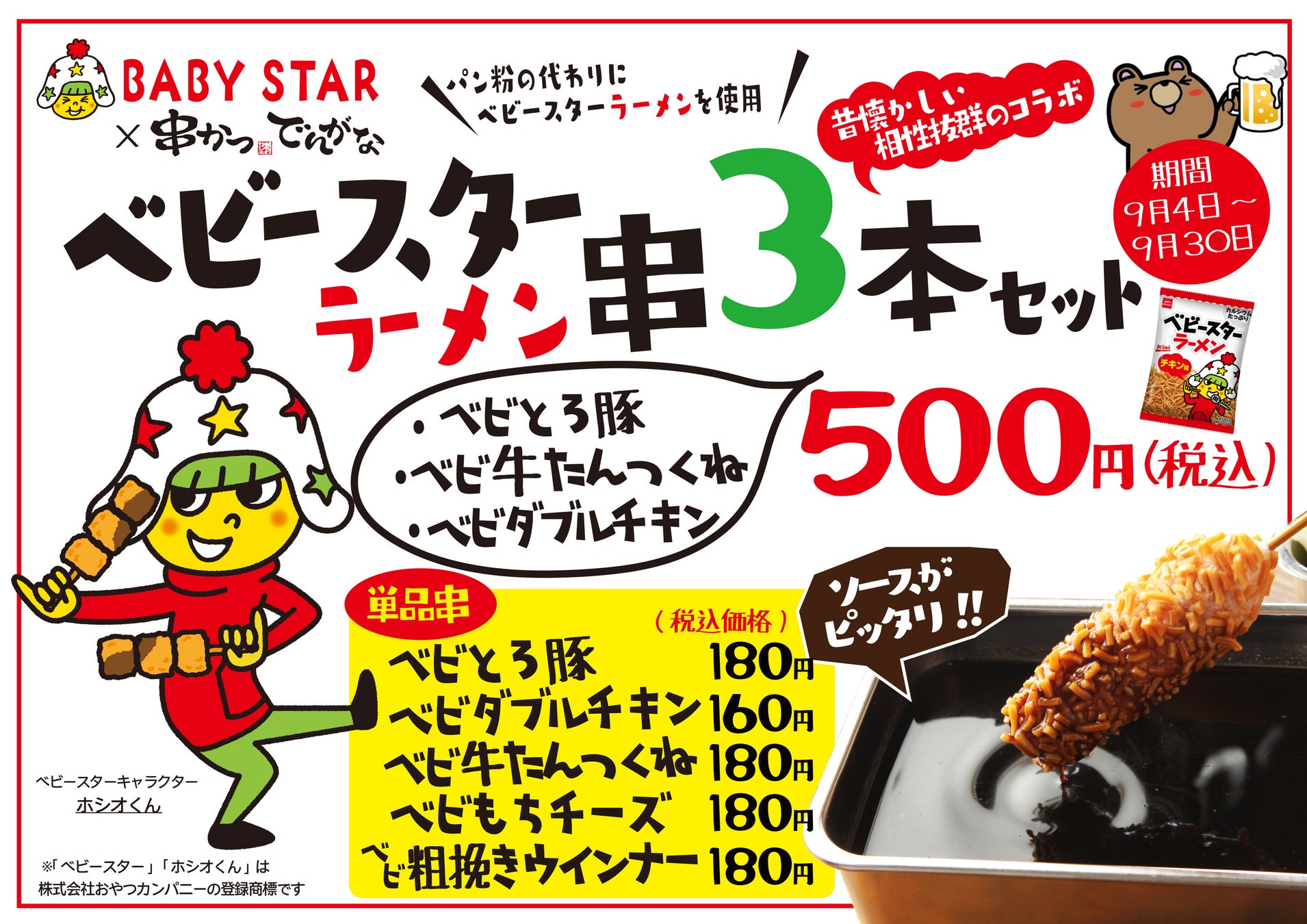 9月4日は年に一度の「串(くし)の日」!「でんがな」で特別コラボ決定!! 「串かつ でんがな」×「ベビースター」期間限定で新メニュー販売!!