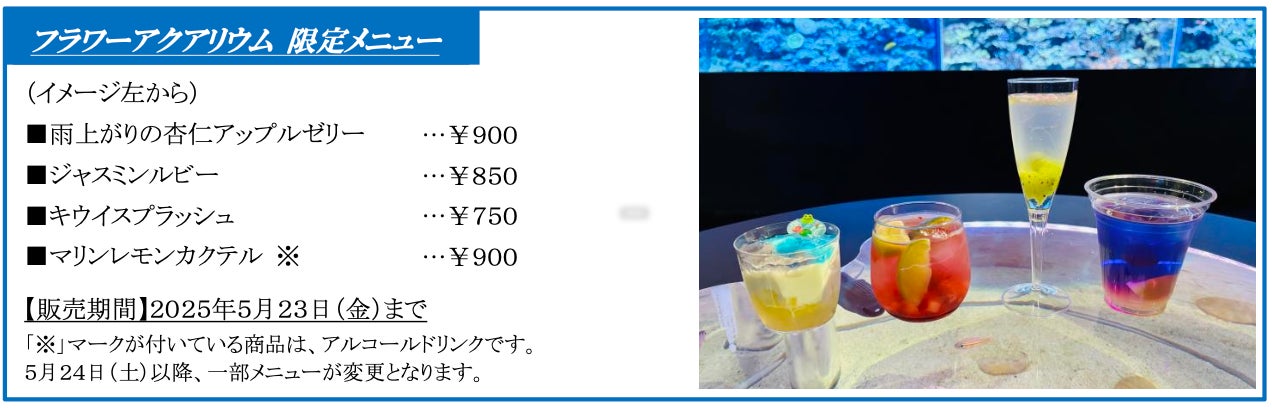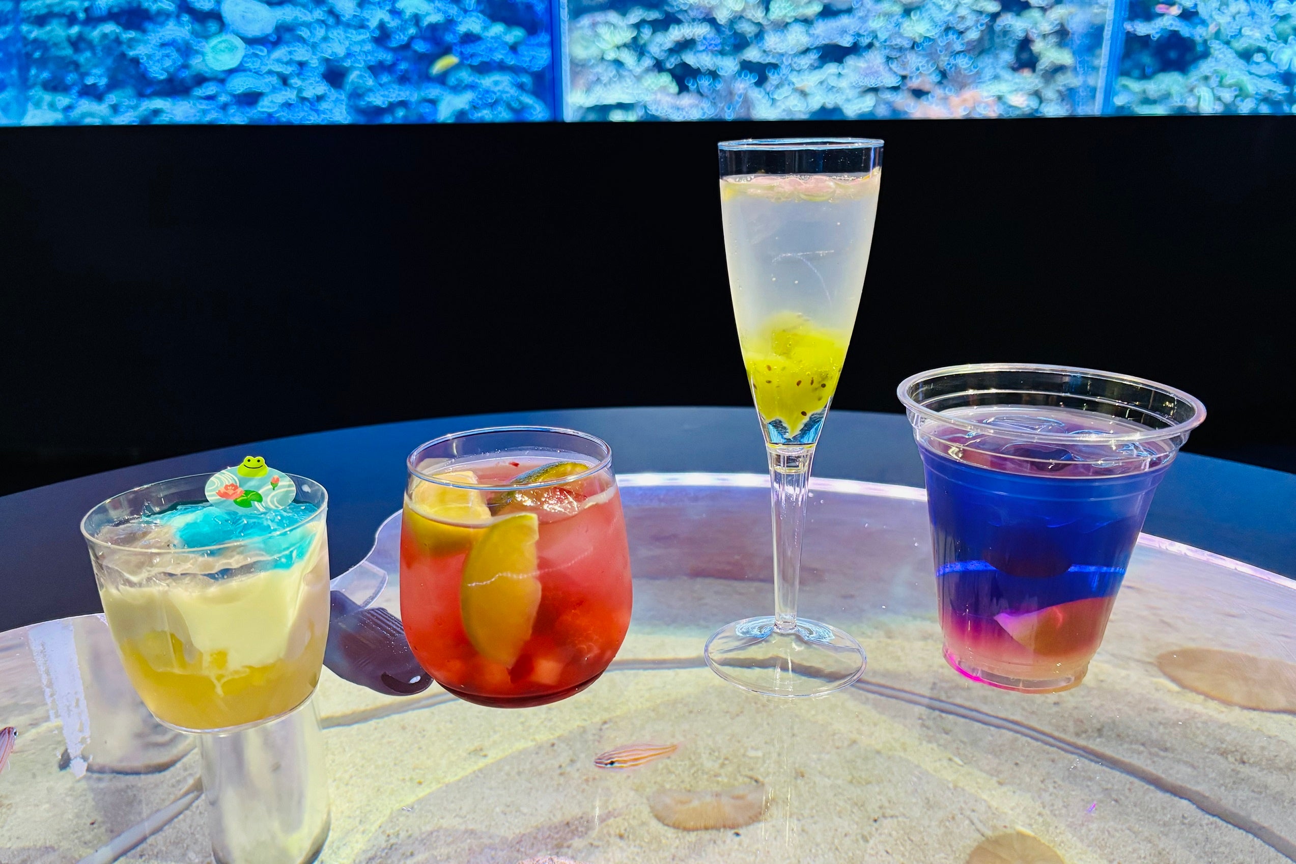 こちらではフラワーアクアリウム限定メニューをご用意しており、ラインナップはシトラスやキウイ風味のドリンクをはじめ、鮮やかなブルーが目を引くカクテル、ひんやりと冷たいスイーツの4種類。
