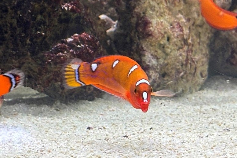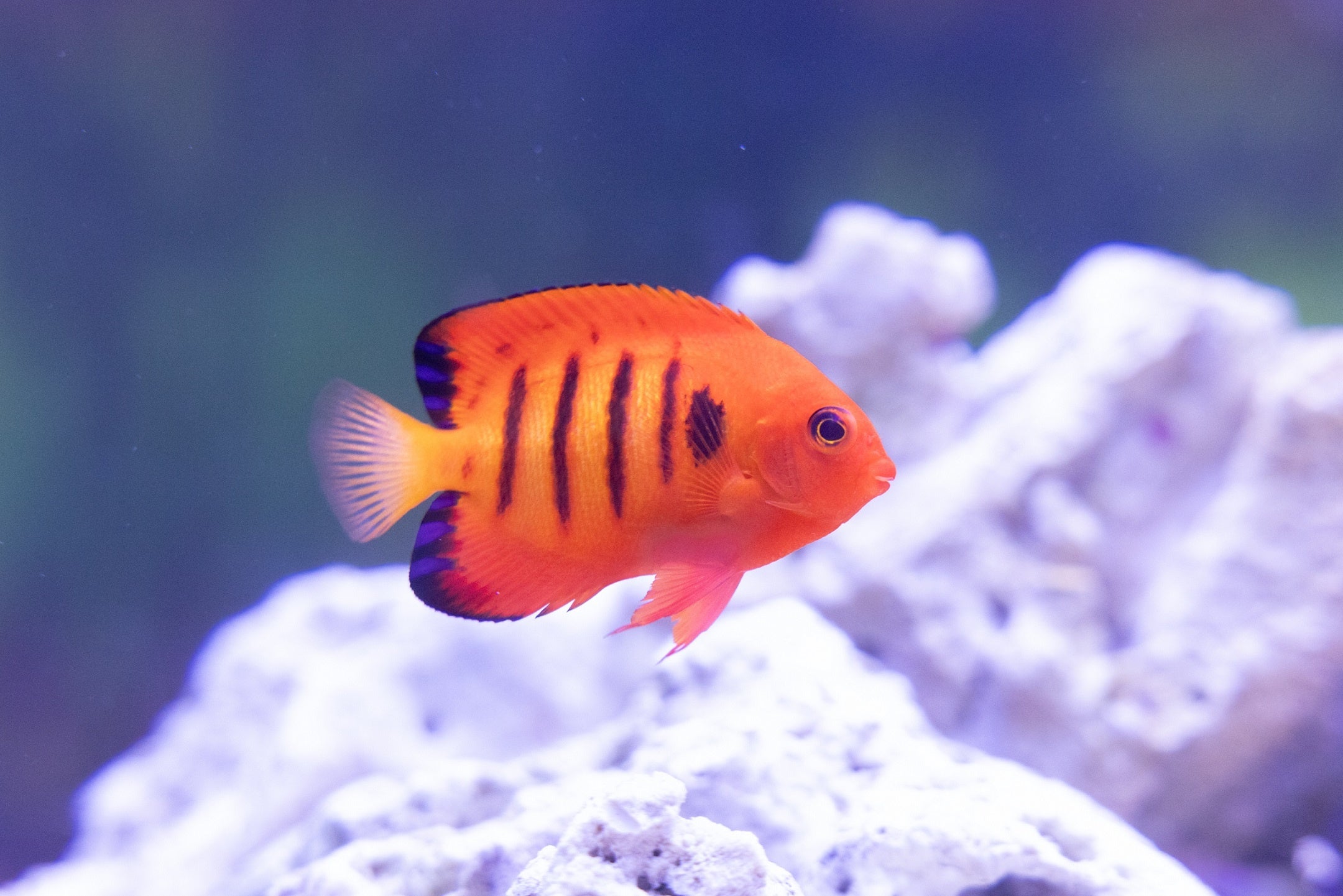 7つの小水槽には初夏の花の“カラー”にちなんだ魚たちを展示。例えば、水彩タッチで描かれた真っ赤なダリアを背景に舞泳ぐのは、朱色をまとう「フレームエンゼル」と「ツユベラ」。さらに、奥に進むに連れて初夏の前・中・後期に旬を迎える花の水槽が順番にご覧いただけ、季節感を色濃くご体感いただけます。