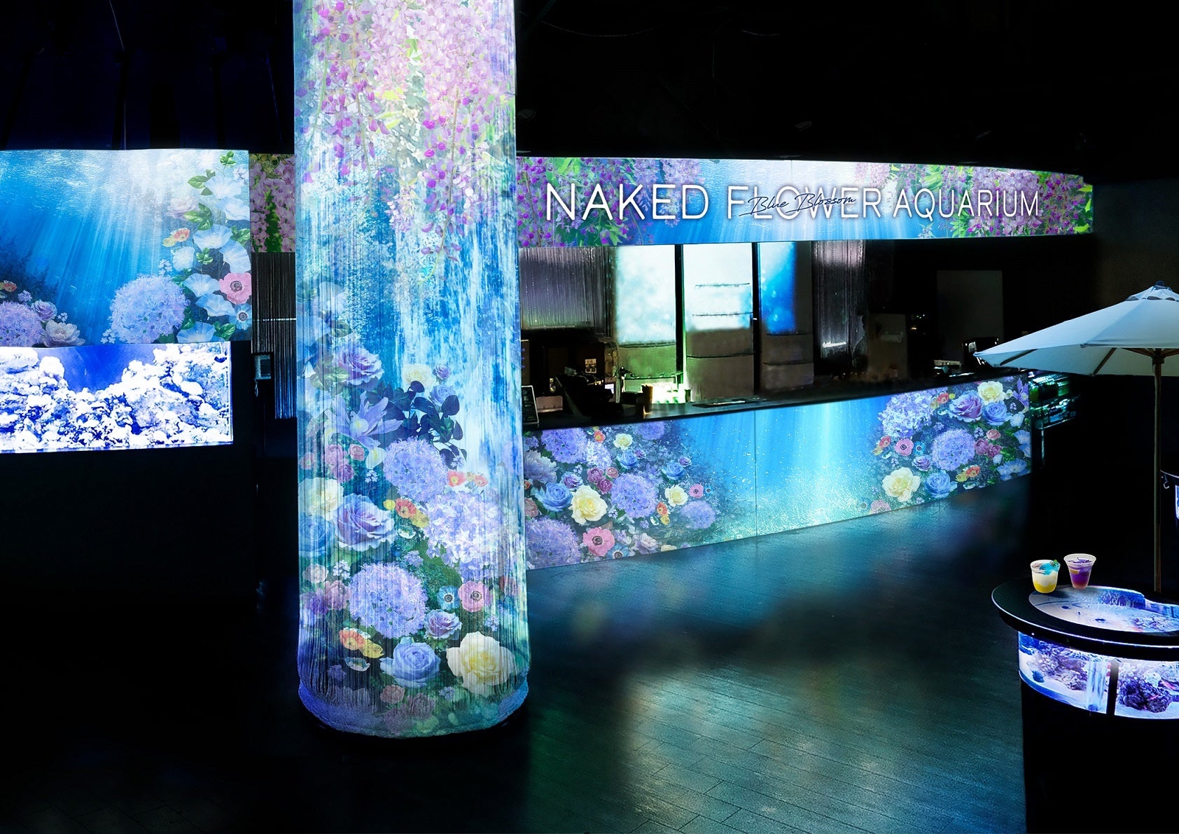 天井や壁面では花びら舞う水中を表現し、水槽と交互に並ぶショウケースは色鮮やかなフラワーアートで飾ります。