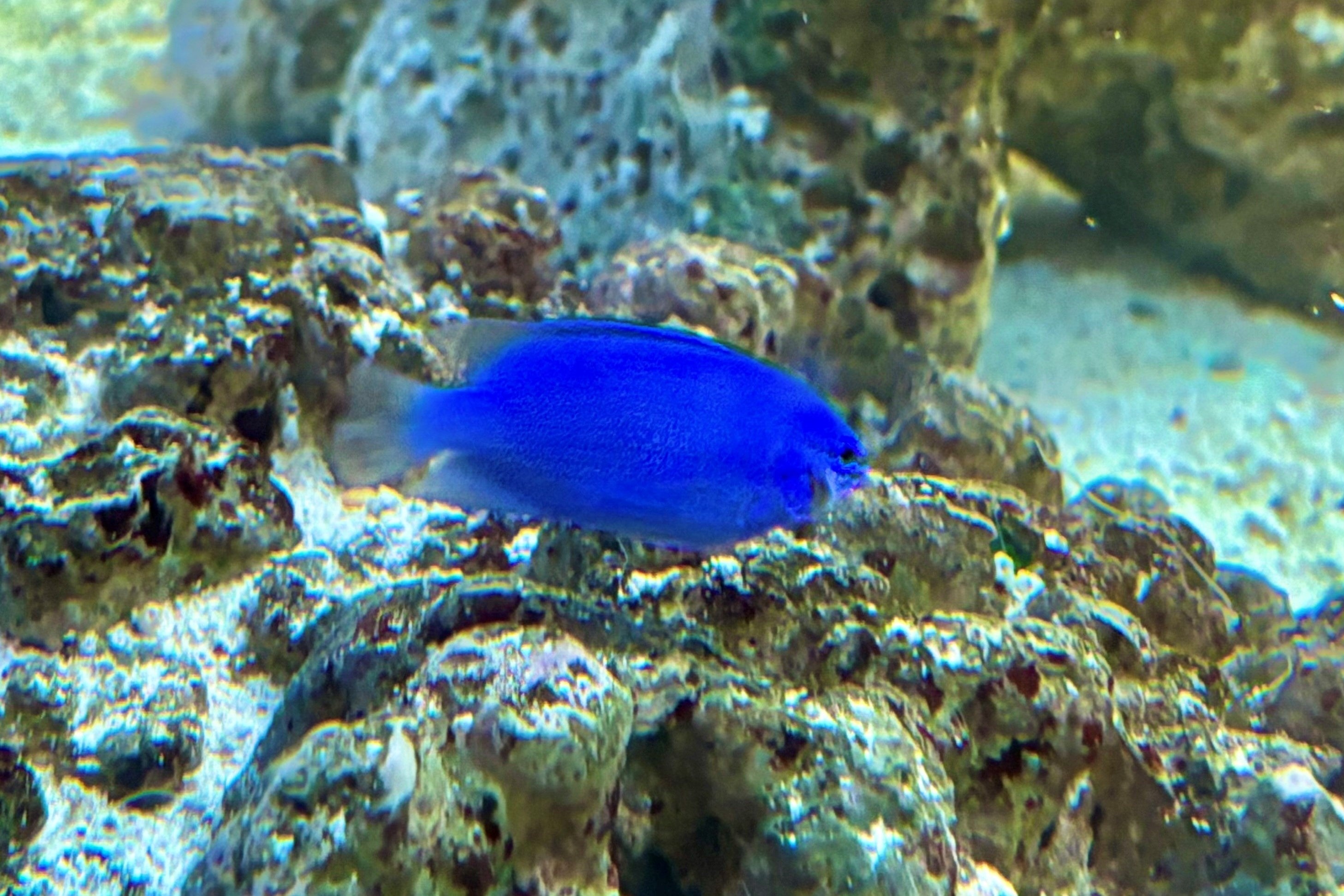 四方を囲む約3.6mの壁に描くのは、美しく移ろう空模様。晴れから雨、輝きに満ちた雨あがりの景色を約3分間かけて表現します。フロアにはしなやかに咲く草花を描き、周囲に並ぶ11本の水槽は「パープルクイーン」や「フジイロサンゴアマダイ」など“初夏の彩り”を想起する生きものを展示。そして「デバスズメダイ」が群れを成す“シンボリック水槽”は、水底にスカイブルーのインテリアフラワーを敷き詰め“ネモフィラ畑”をイメージしました。
