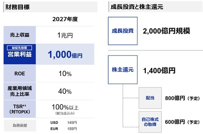 CS B2027では、事業の役割を明確化し、事業ごとに設定された重点指標に基づいた戦略を遂行することで、売上収益1兆円、および最優先指標である営業利益額1,000億円を目指す。ROE目標は10%、産業用領域の売上比率は40%を掲げている。また、資本コストと株価を意識した経営を推進し、TSR*¹は対TOPIXで100%以上を目指す。