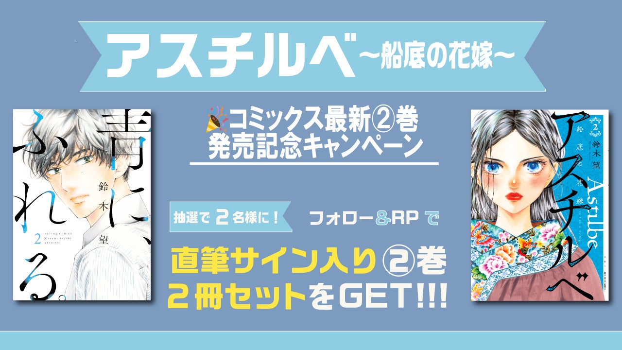 鈴木望双葉社公式アカウント(@suzukinozomi_f)にて、『アスチルベ~船底の花嫁~』と『青に、ふれる。』の2巻イラスト入り直筆サイン本を2冊セットで抽選2名様にプレゼント! 公式アカウントをフォローのうえ、キャンペーンポストをRPすれば応募完了です。