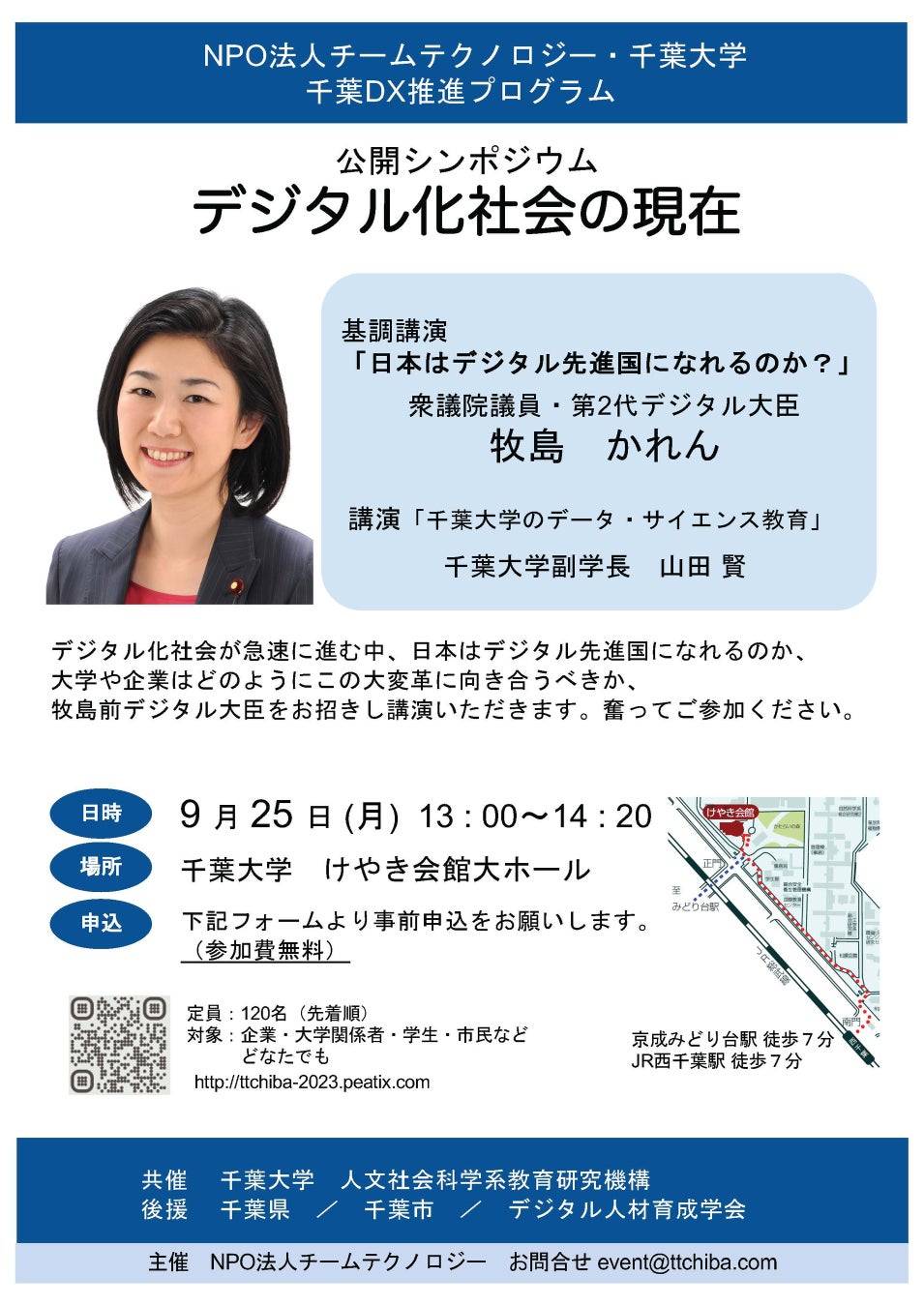 9月25日(月)、千葉発のNPO法人「チームテクノロジー」と千葉大学人文社会科学系教育研究機構との共催による公開シンポジウム「デジタル化社会の現在」を開催します。