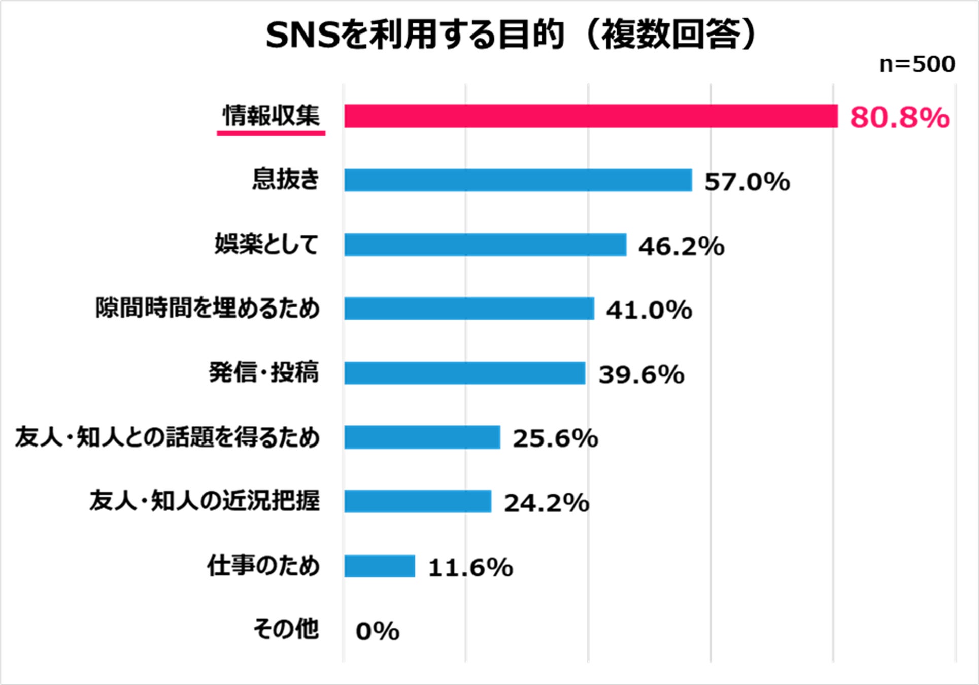 使っているSNS 1位は「Instagram」。利用目的は「情報収集」「息抜き」。約6割は発信・投稿をしない