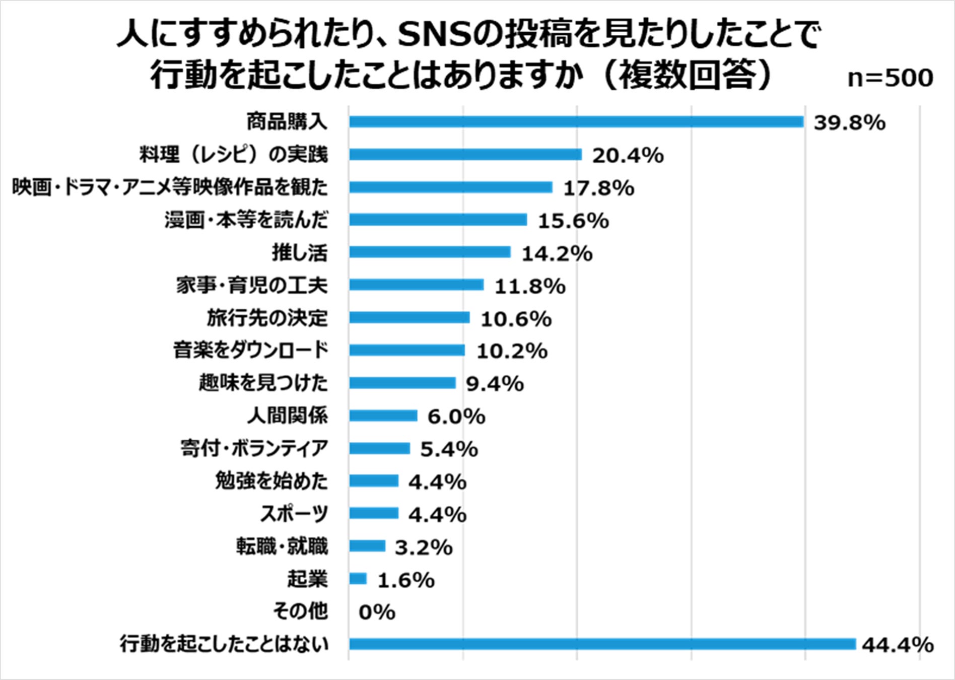 誰かにすすめられて、自分自身の行動が変化した経験についても聞きました。その結果、半数以上が行動を起こした経験があることがわかりました。さらに、他人にすすめられたことを、自分も好きになった経験がある人は約半数でした。