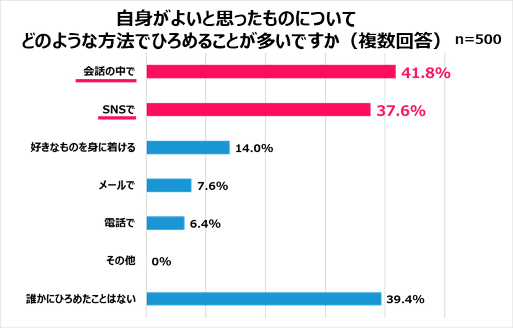 2024年9月時点で、全国の20代~30代女性を対象に、魅力をひろめたい・ひろめるべきだと思っているものはあるか聞いたところ、「ひろめたいものはない(40.8%)」と回答した人を除き、約6割の人はひろめたい・ひろめるべきだと思っているものがあるとわかりました。「動物愛護活動(11.2%)」や「環境保全活動(10.6%)」、「周りの人(魅力・行動など)(6.8%)」と回答した人もおり、活動や行動を含む幅広いジャンルに票が入りました。ひろめる方法は「会話の中で(41.8%)」「SNSで(37.6%)」と回答した人が特に多い結果となりました。「誰かにひろめたことはない(39.4%)」と回答した人を除き、6割以上は自身がよいと思ったものについて、誰かにひろめているようです。