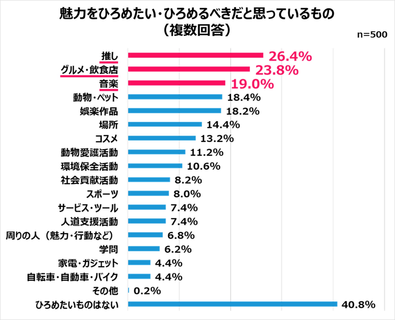 魅力をひろめたいもの1位「推し」2位「グルメ・飲食店」3位「音楽」。ひろめる方法は「会話」「SNS」
