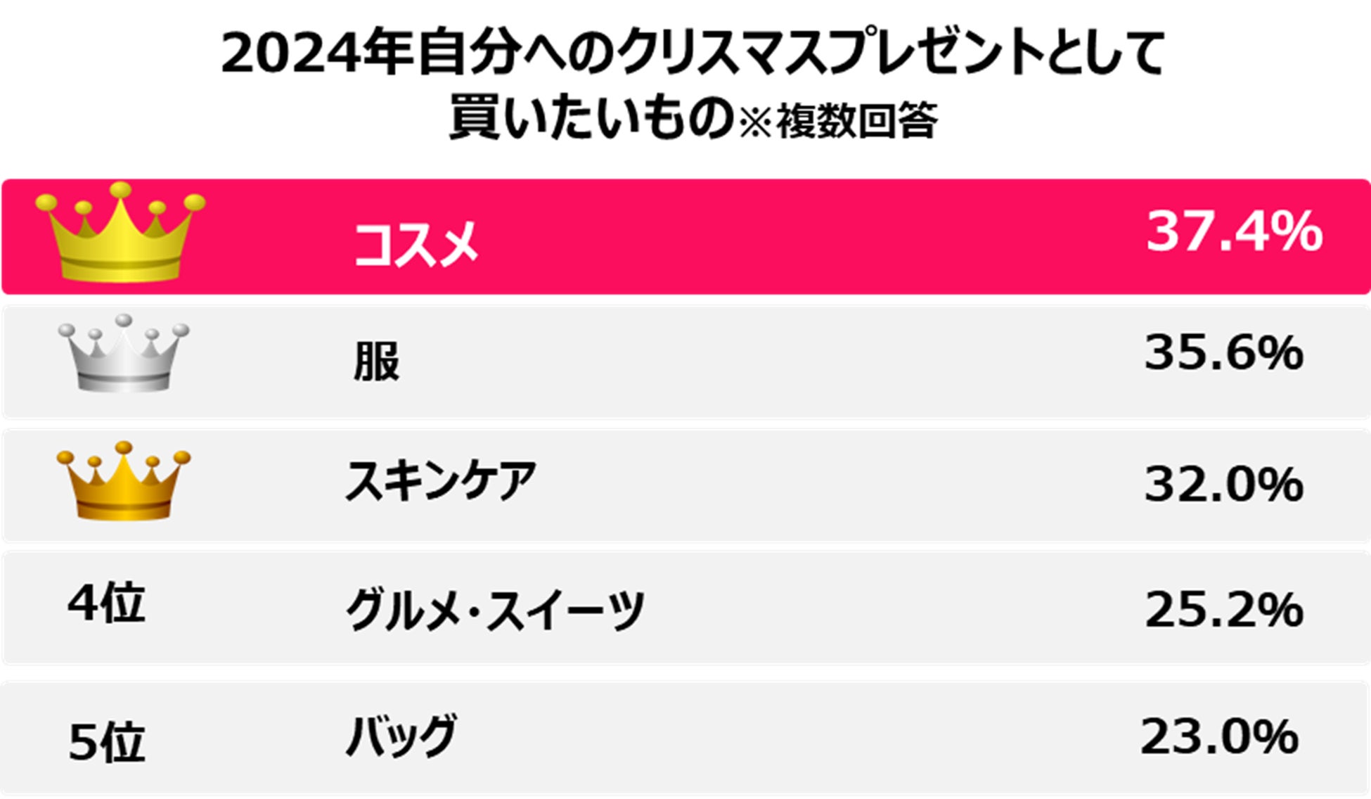 2024年11月には、一年の終わりに差し掛かり自分自身の頑張りを振り返る時期であることを踏まえて、クリスマス~年末年始の買い物について調査を実施。自分へのクリスマスプレゼントを買いたいか聞いたところ、7割以上の女性が、買いたいものがあると回答しました。特に人気だったのは「コスメ(37.4%)」「服(35.6%)」「スキンケア(32.0%)」でした。