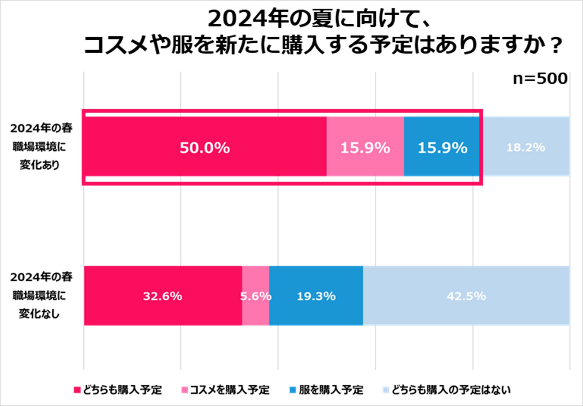 2024年の新年度、職場環境に変化があった人ほど夏のコスメ・服の購入意欲が高かった。