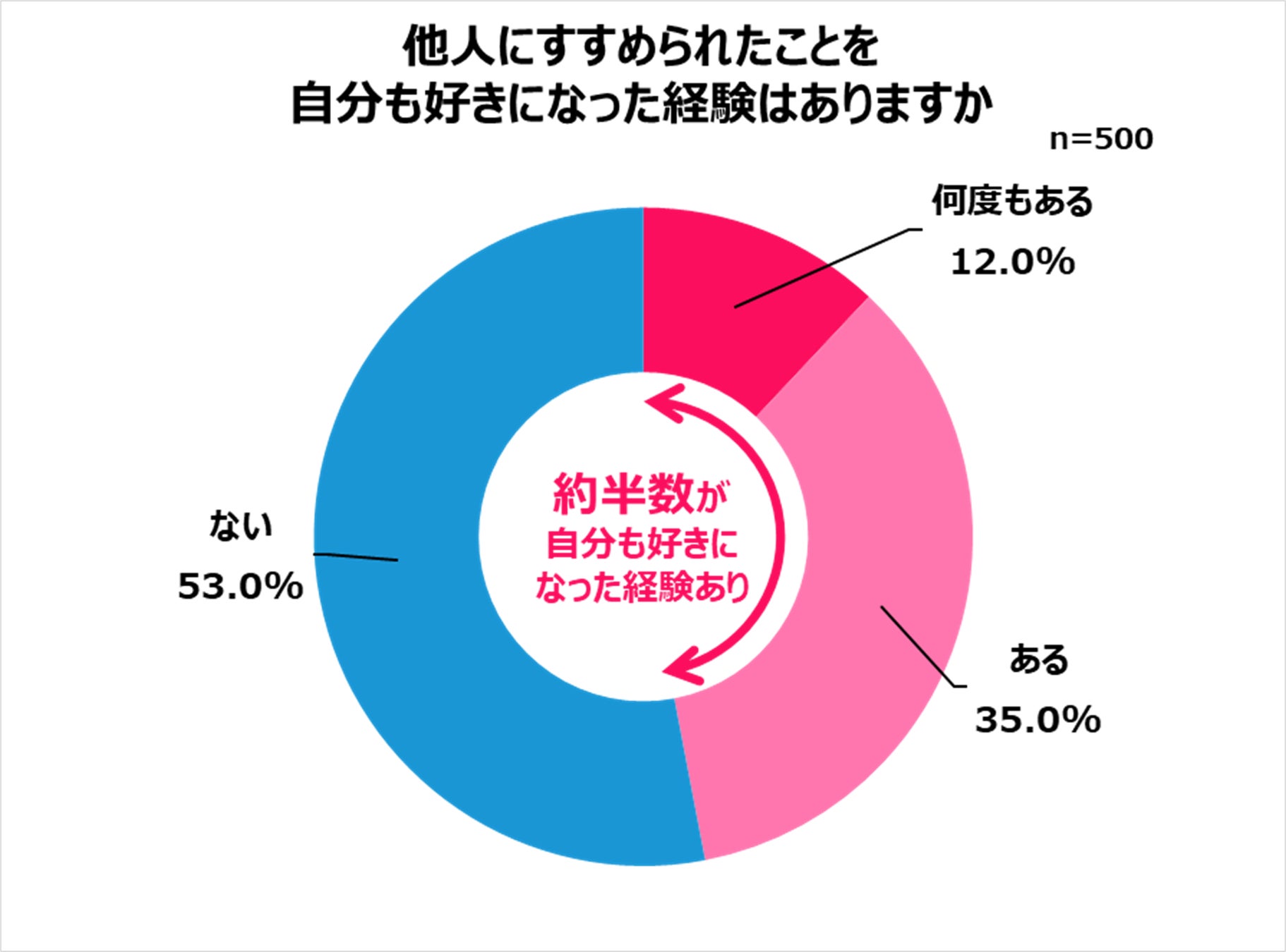 他人にすすめられたことを自分も好きになった経験がある人は約半数