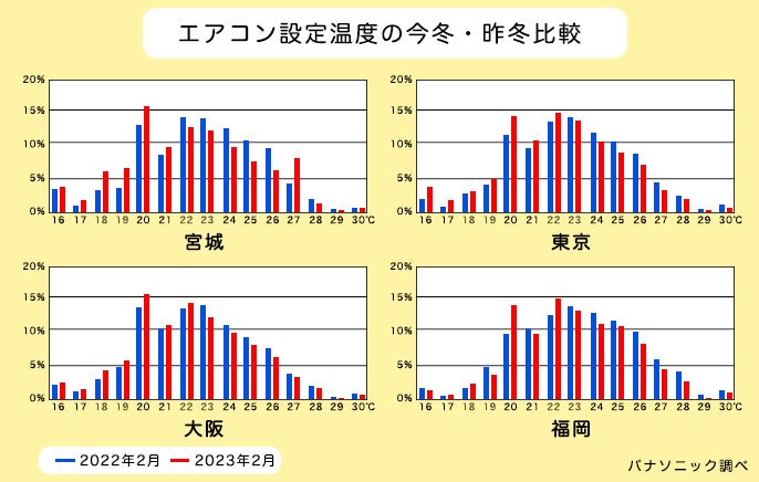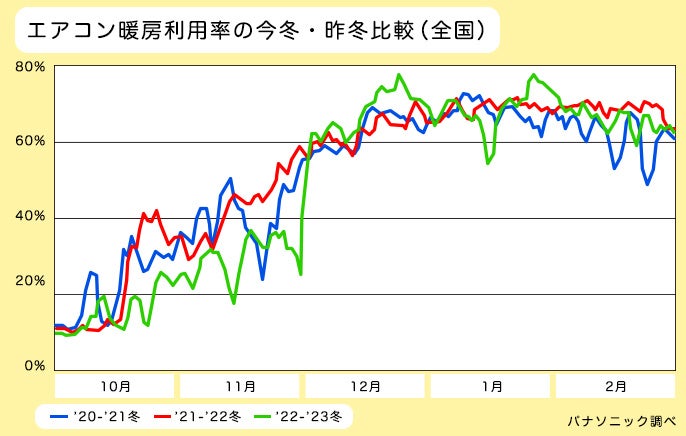 パナソニックは、エオリアアプリに接続したエオリアユーザーの利用データをもとに、「2022年-2023年 冬のエアコン使用実態調査」を実施。今冬のエアコン暖房利用時間・利用率・設定温度を、過去の冬シーズン同期間と比較しました。