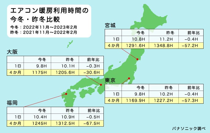 4地域すべてにおいて、今シーズンは昨シーズンよりもエアコン暖房利用が減少。宮城県57.2時間減、東京都57.3時間減、大阪府30.6時間減で、中でも一番減少していたのが福岡県で67.5時間もの減少となっています。