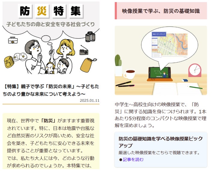防災意識を高めるための専門家へのインタビュー記事や教育的な映像を通じて、災害の種類やその影響、そして具体的な避難行動や備えについて学ぶことができます。