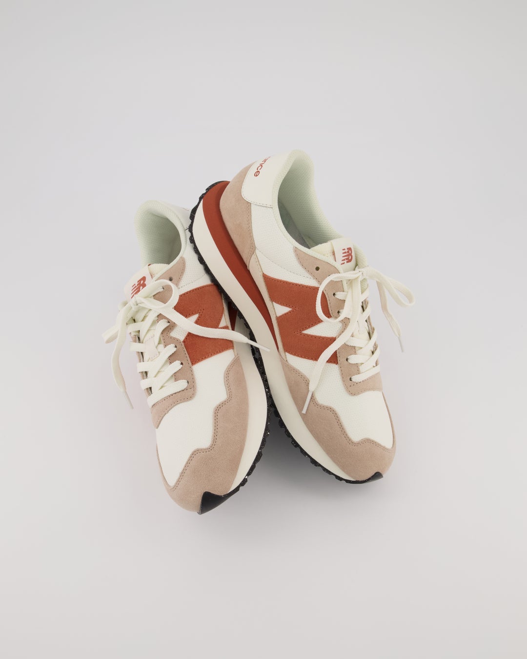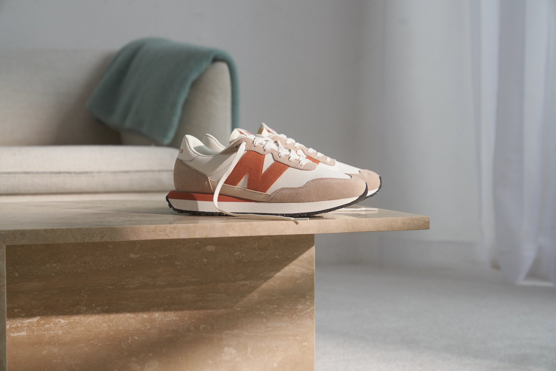 1980年代のニューバランスのアーカイブモデル「420」「1300」「Gator」から着想を得たスリム&ロープロファイルなシルエットをモダンデザインに落とし込み誕生した「237」にサステナビリティプログラム対象商品が登場。「237」は、2020年発売し瞬く間に人気モデルとなった「327」に続き、2021年にデビューしたモデルです。レトロな雰囲気でありながら、新鮮さを感じさせる現代的なデザインが特徴です。異素材を組み合わせたアッパー、切りっぱなしのタン、巻き上がりのアウトソールに加え、70年代モデルから着想を得た前作「327」と同じくインパクトを放つビッグ N ロゴや切込みのアイレットなどのディテールも採用。レトロなムードを受け継ぎながら、様々なスタイリングで活躍する汎用性の高いデザインに仕上がっています。