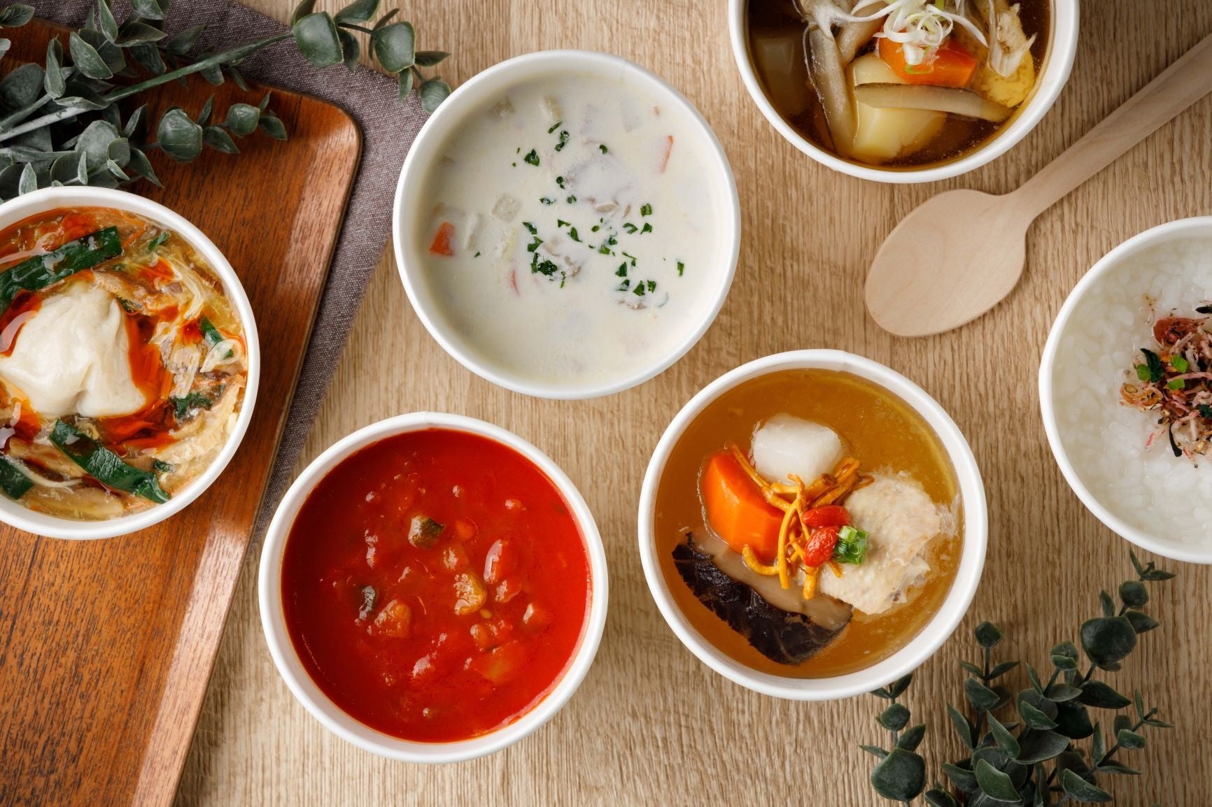 チキンケネルとゴロゴロ野菜のブイヨンスープ/心身ととのう薬膳蒸しスープ/こだわり出汁と盛岡紅木豚の旨みとん汁/DISH UP特製 大豆ミートのハンバーグカレー/四川麻婆飯/鶏そぼろの掻き玉餡かけご飯