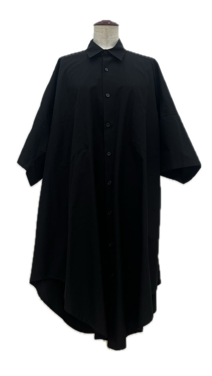 7分丈スリーブのシャツ型フレアワンピース。アシンメトリーなヘムラインで動きのあるシルエット。コットン