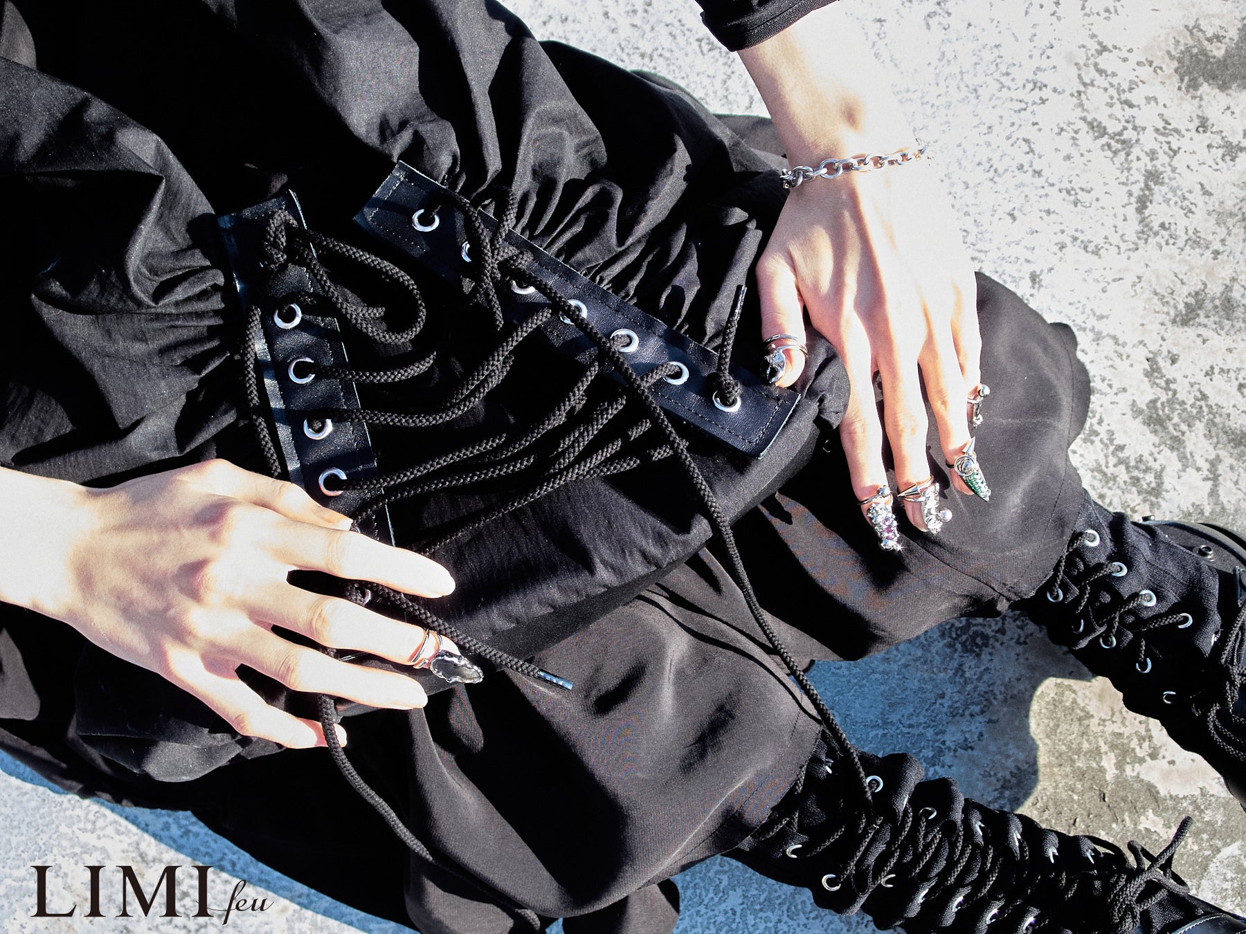 チュール密度の高いミニ丈スカート。黒テープのドロースタイルがパンキッシュ。ポリエステル *総丈45/55×W62×H125 cm
