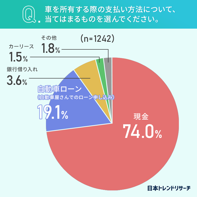 74%の方が、車購入時の支払い方法は「現金」と回答し、もっとも多い結果になりました。