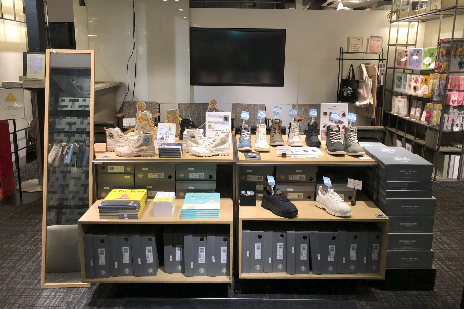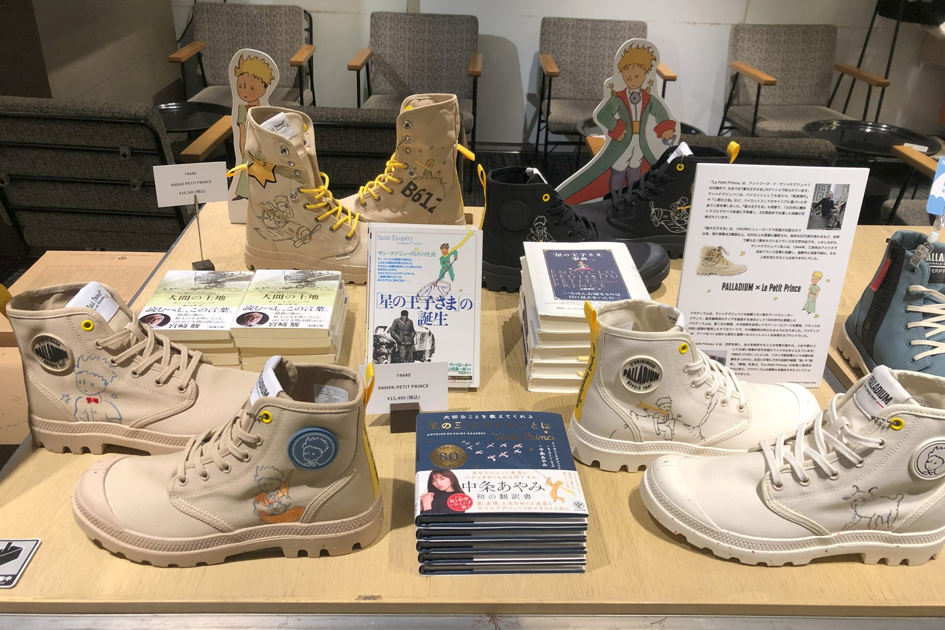 中目黒蔦屋書店のポップアップショップはパラディウムの防水ブーツ「パンパハイシーカー2」、50年代のハイカーシューズの復刻「パラショック」に防水機能を搭載したローカットモデル、『星の王子さま』コラボを展開。『星の王子さま』の絵本など、関連書籍もシューズと共に並んでいます。