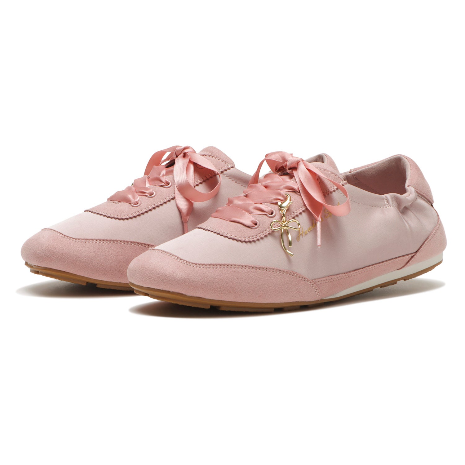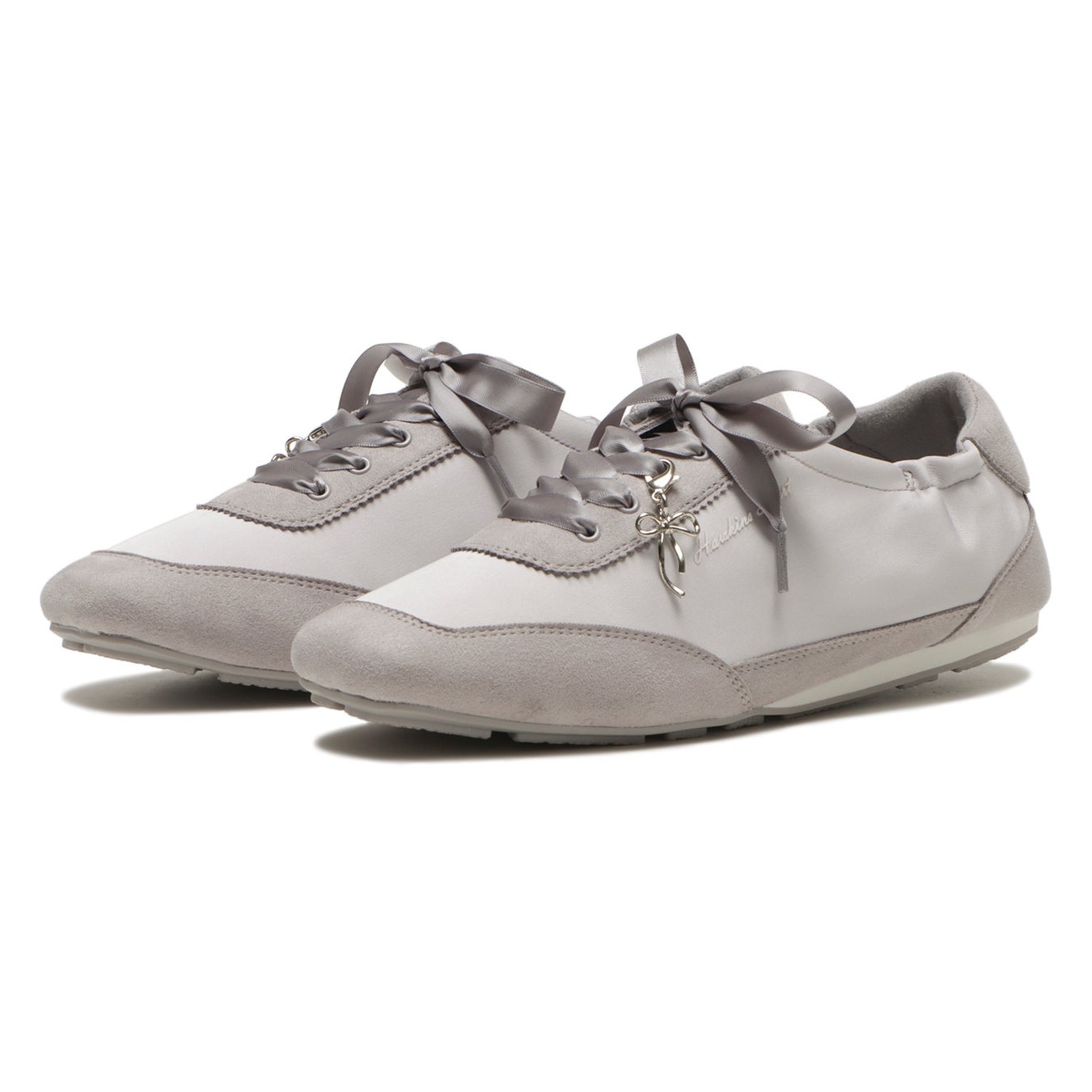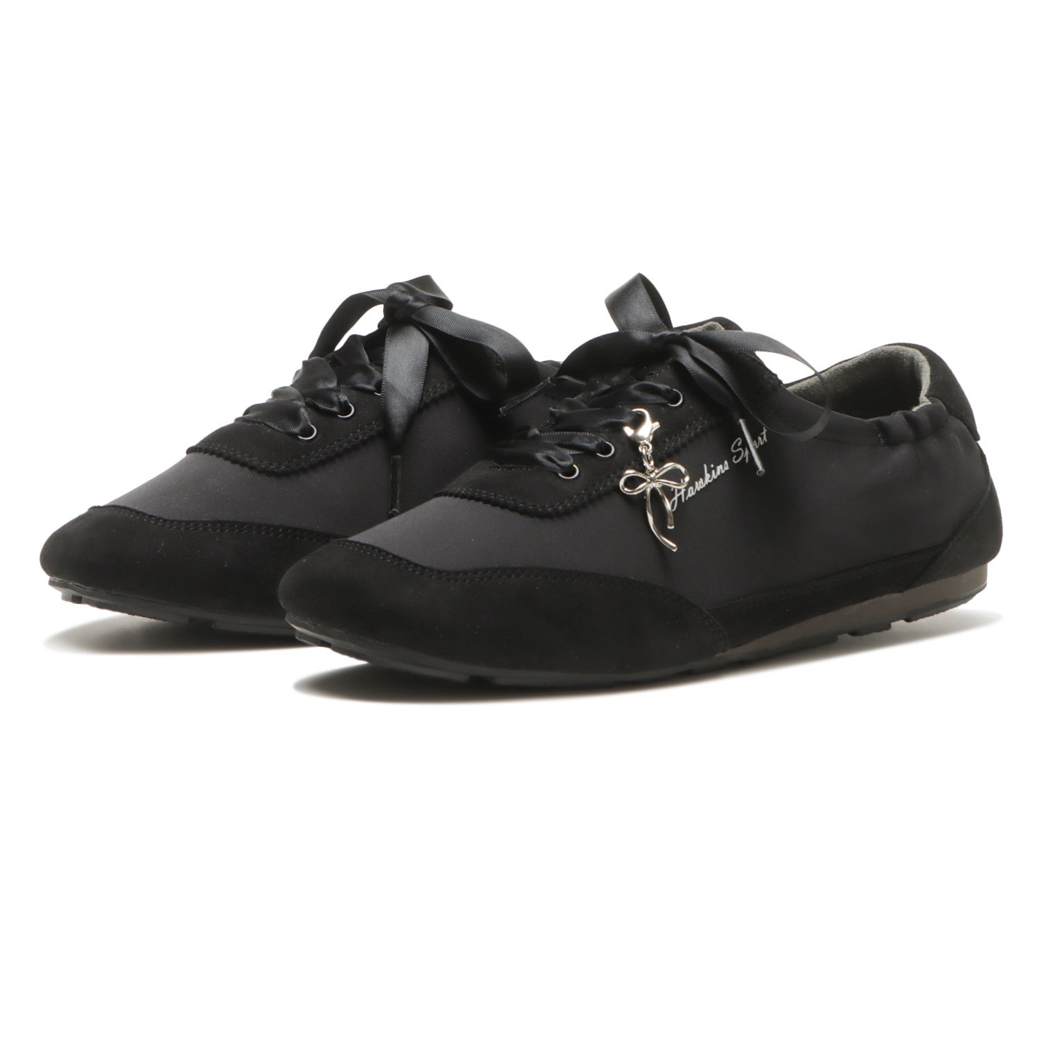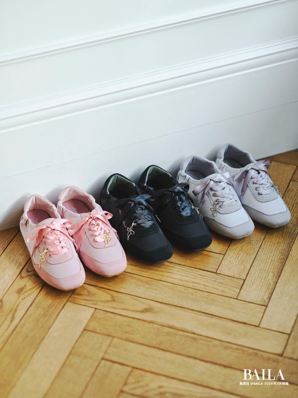 バレエのトゥシューズの様な華奢でフェミニンなデザインの薄底スニーカー。サテン素材のアッパーとリボンモチーフのチャームがバレエコアやリボンディティールのトレンドをしっかり押さえた1足。すっきりした見た目ながら、スクエアトゥの形状に柔らかいアッパーと低反発インソールのクッション感、屈曲性のあるアウトソールで、履き心地: (左から順に) BLACK、PINK、GRAY