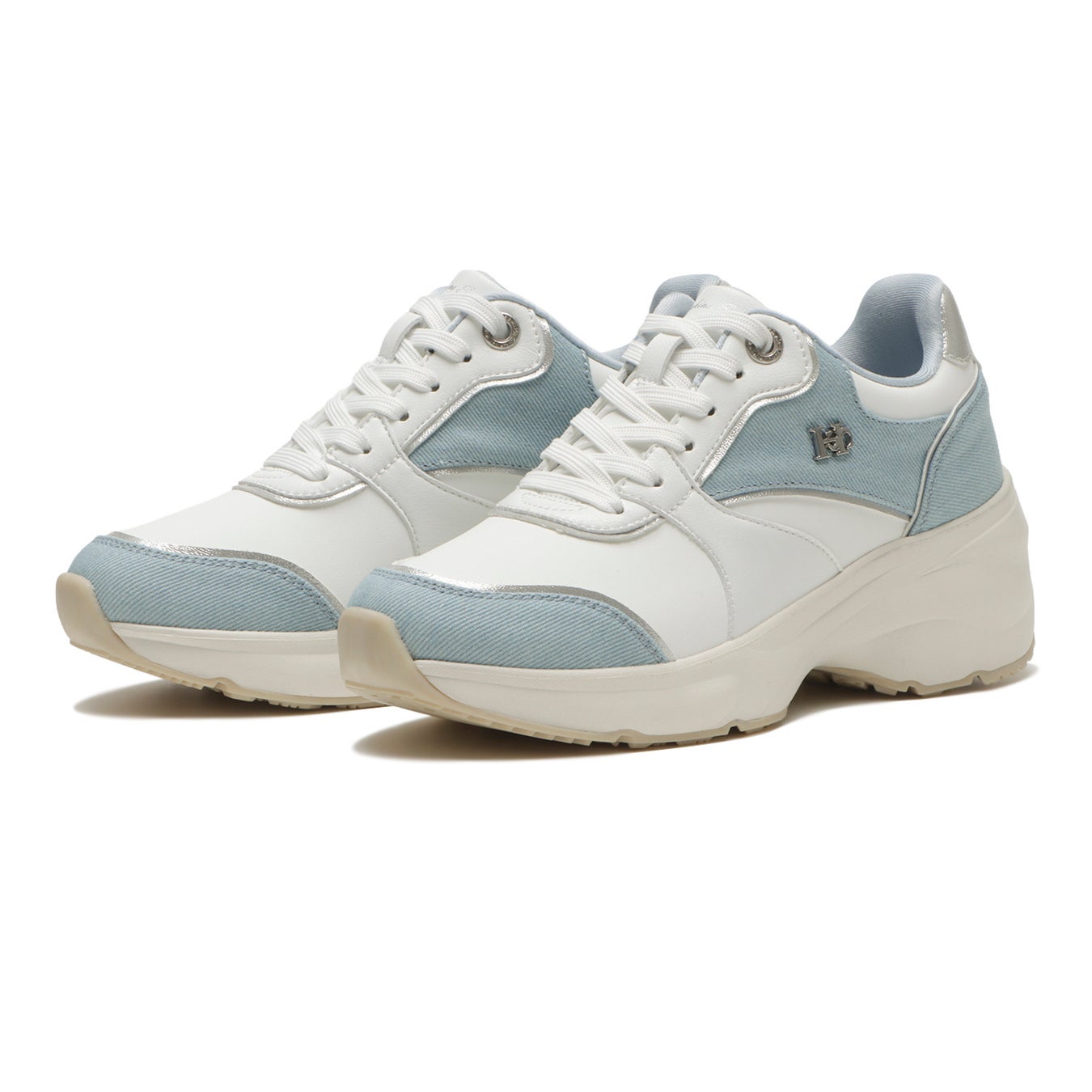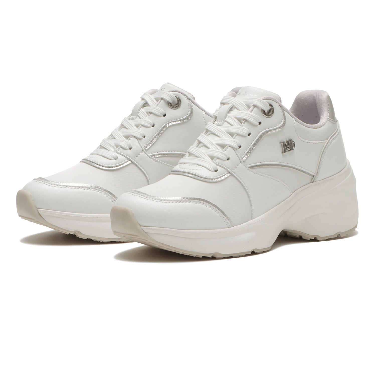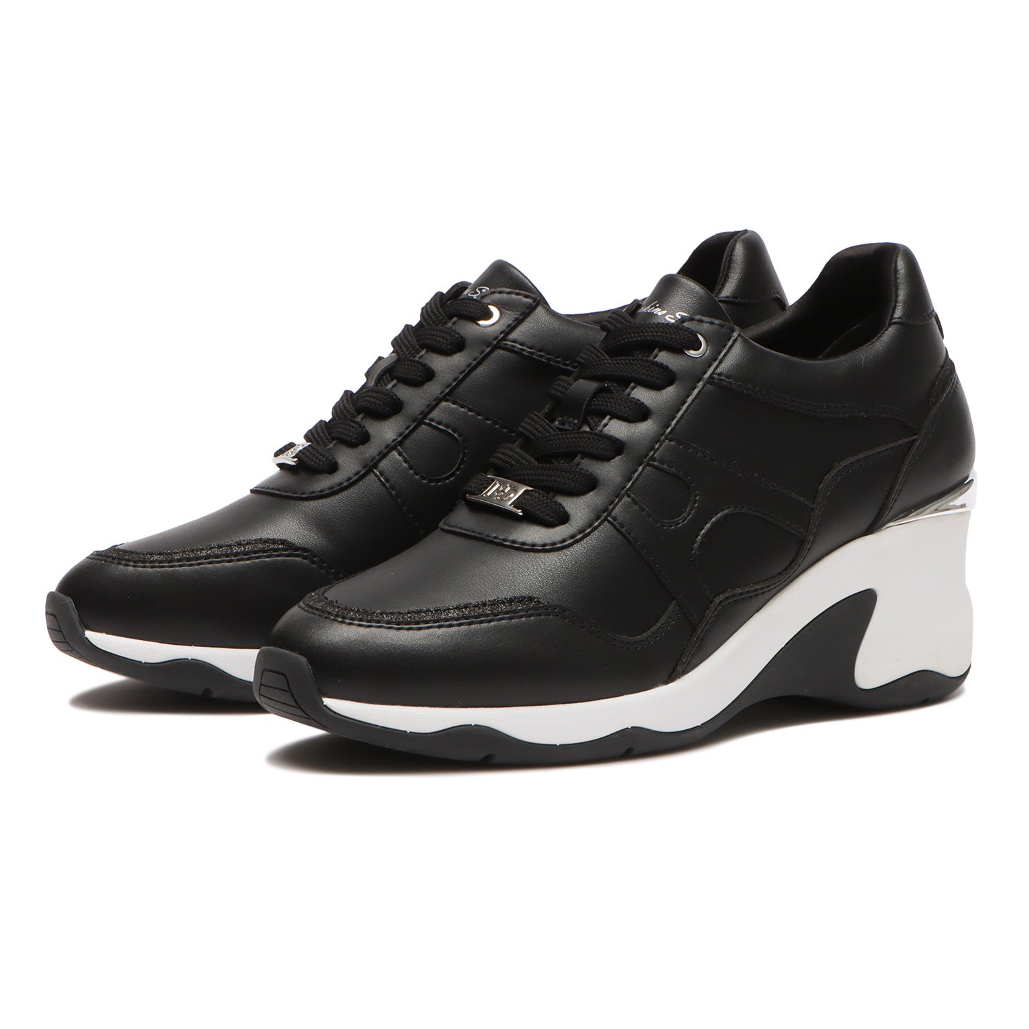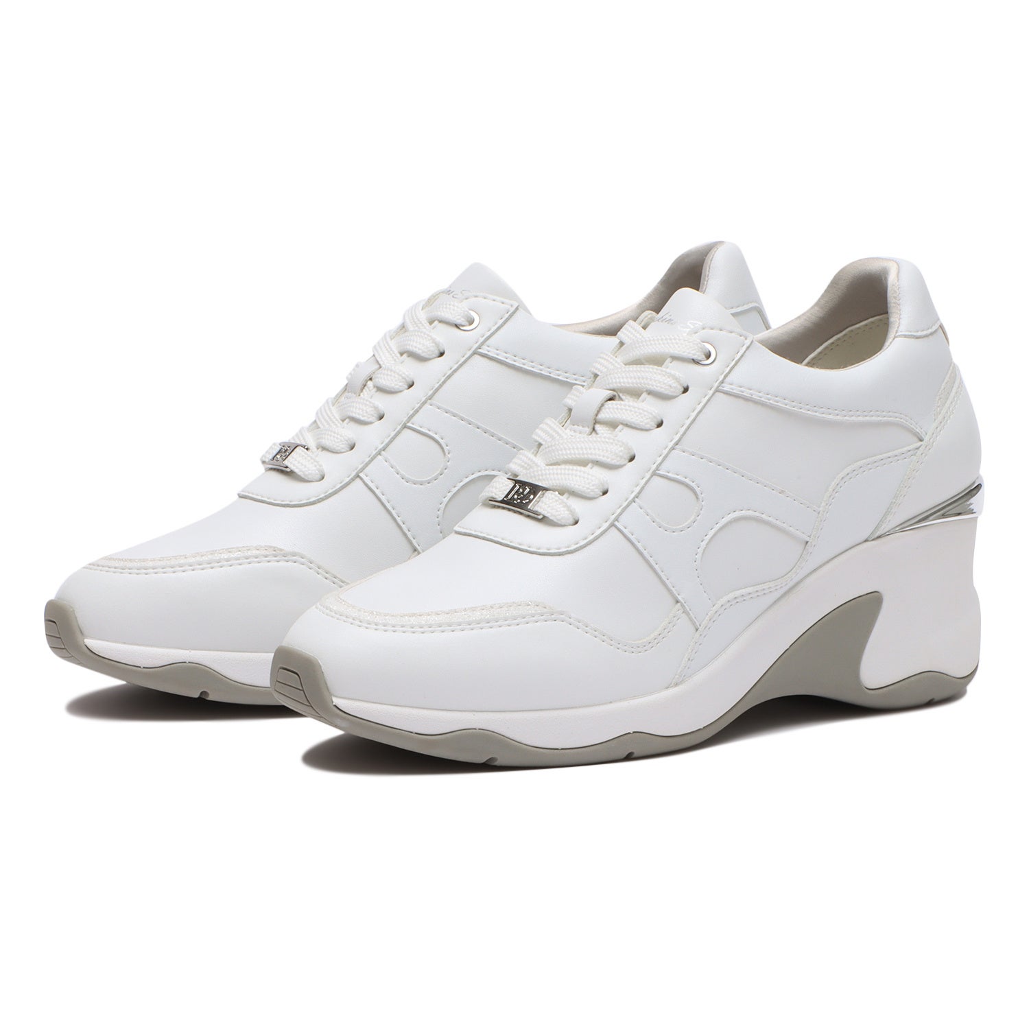 フェミニンなコーディネートにもピッタリのヒールアップスニーカー。ストーン付きのアイレットとシャイニー素材が華やかさを演出してくれます。