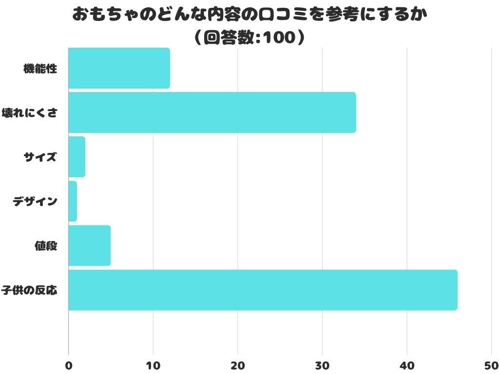 おもちゃのどんな内容の口コミを参考にするかをアンケートにて調査したところ、1位は「子供の反応」でした。