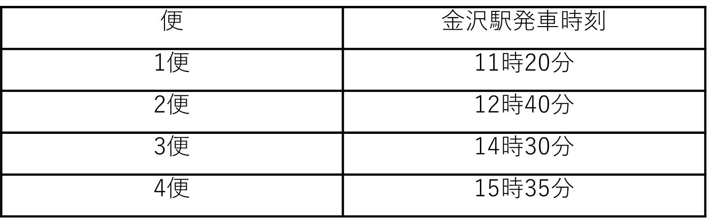 ・乗車便の発車時刻に乗り場にいらっしゃらない場合は、キャンセルと見なし定刻通りに金沢駅を発車します(列車遅延時も同等の扱いになります)