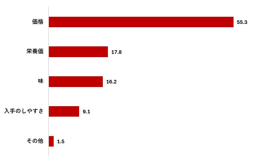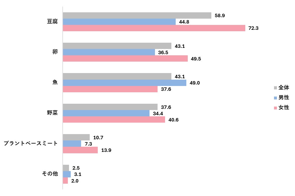肉の代替品として選ぶものは、女性が「豆腐」「卵」、男性は「魚」「豆腐」が上位だった。また、肉の代替品を選ぶ際に最も重視する要素として「価格」が半数以上を占めた。