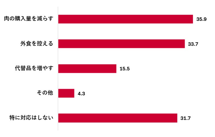 価格高騰が続く場合、「肉の購入量を減らす」(35.9%)や「外食を控える」(33.7%)の一方、「特に対応はしない」(31.7%)も一定数を占める