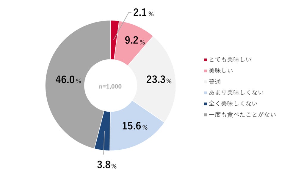 プラントベースミート(大豆ミートなど植物由来の代替肉)の味について伺ったところ、「普通」が23.3%だった。一方で「一度も食べたことがない」が46.0%と約半数を占めた。