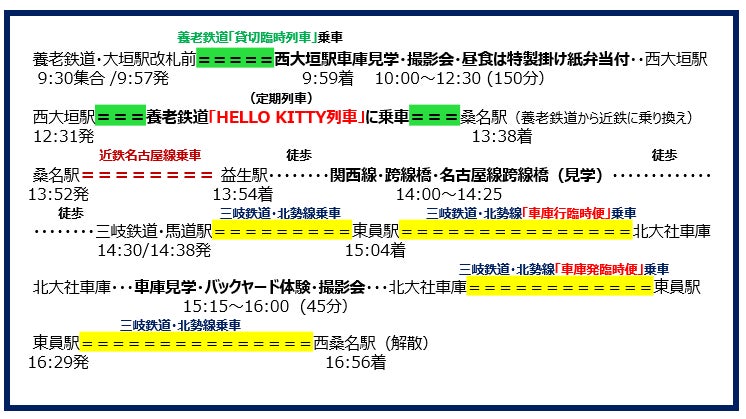本ツアーで乗車するローカル鉄道2社は、三重県の桑名市を中心位置にして、北へ岐阜県西美濃地域と三重県桑名市を結ぶ全長約57キロの「養老鉄道」と西へ三重県北勢地域を走る「三岐鉄道」です。この2社の鉄道車両を乗り継ぎ、普段見ることのできない「車両車庫」を見学体験します。養老鉄道では、日本旅行とも取り組んでいる「つなぐHELLO KITTYキャンペーン」の一つでもある「HELLO KITTYラッピング車両」にも乗車します。さらに、養老鉄道特製掛け紙のお弁当でご昼食、写真撮影会、両社のオリジナルグッズの販売等も行われます。