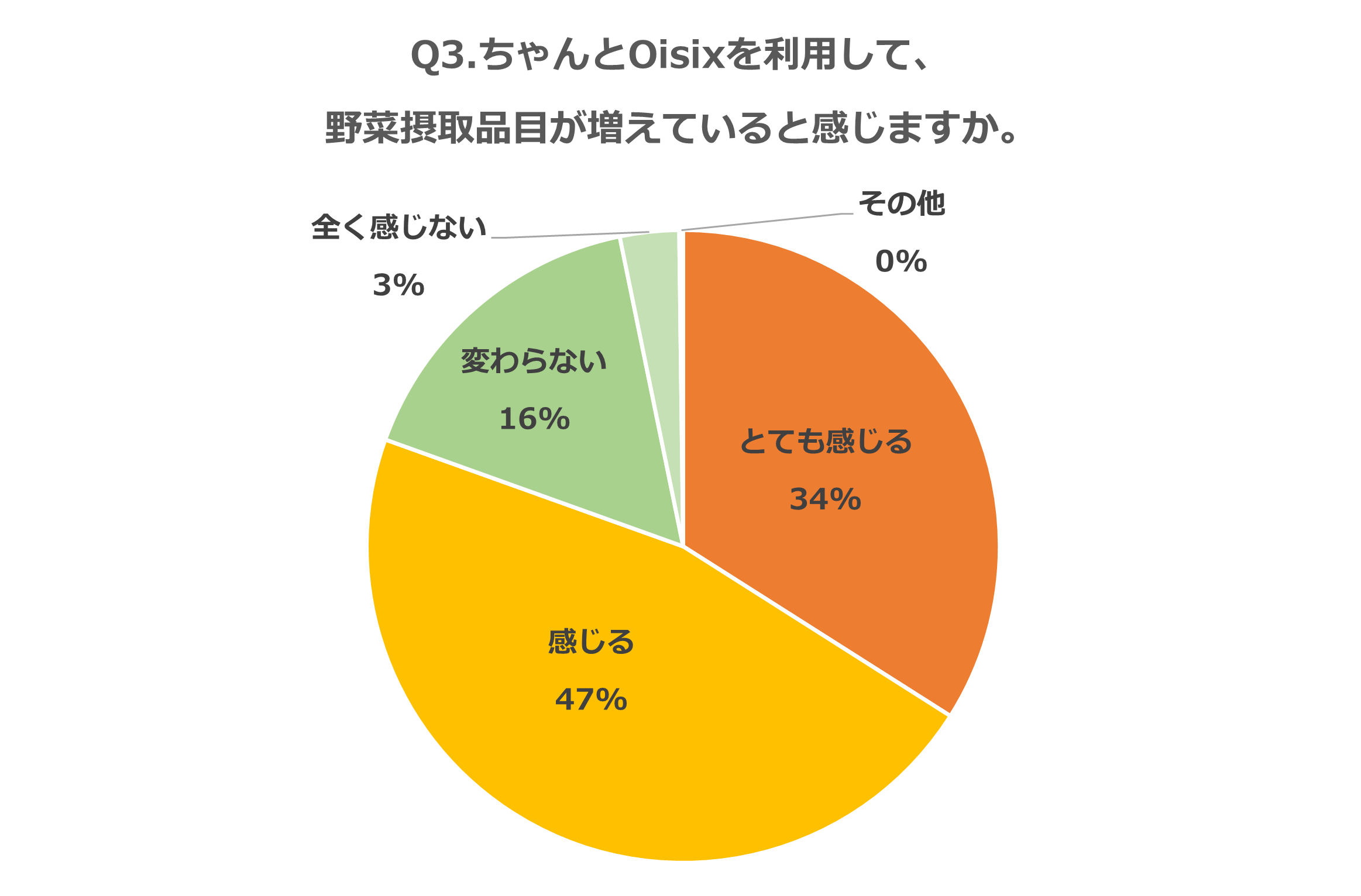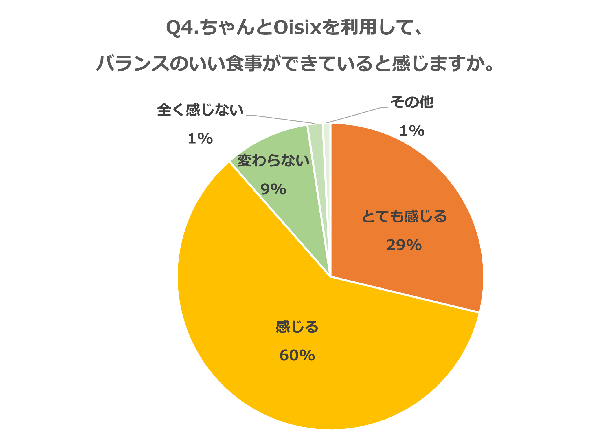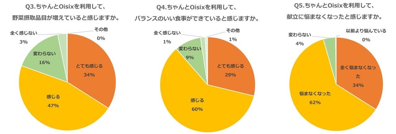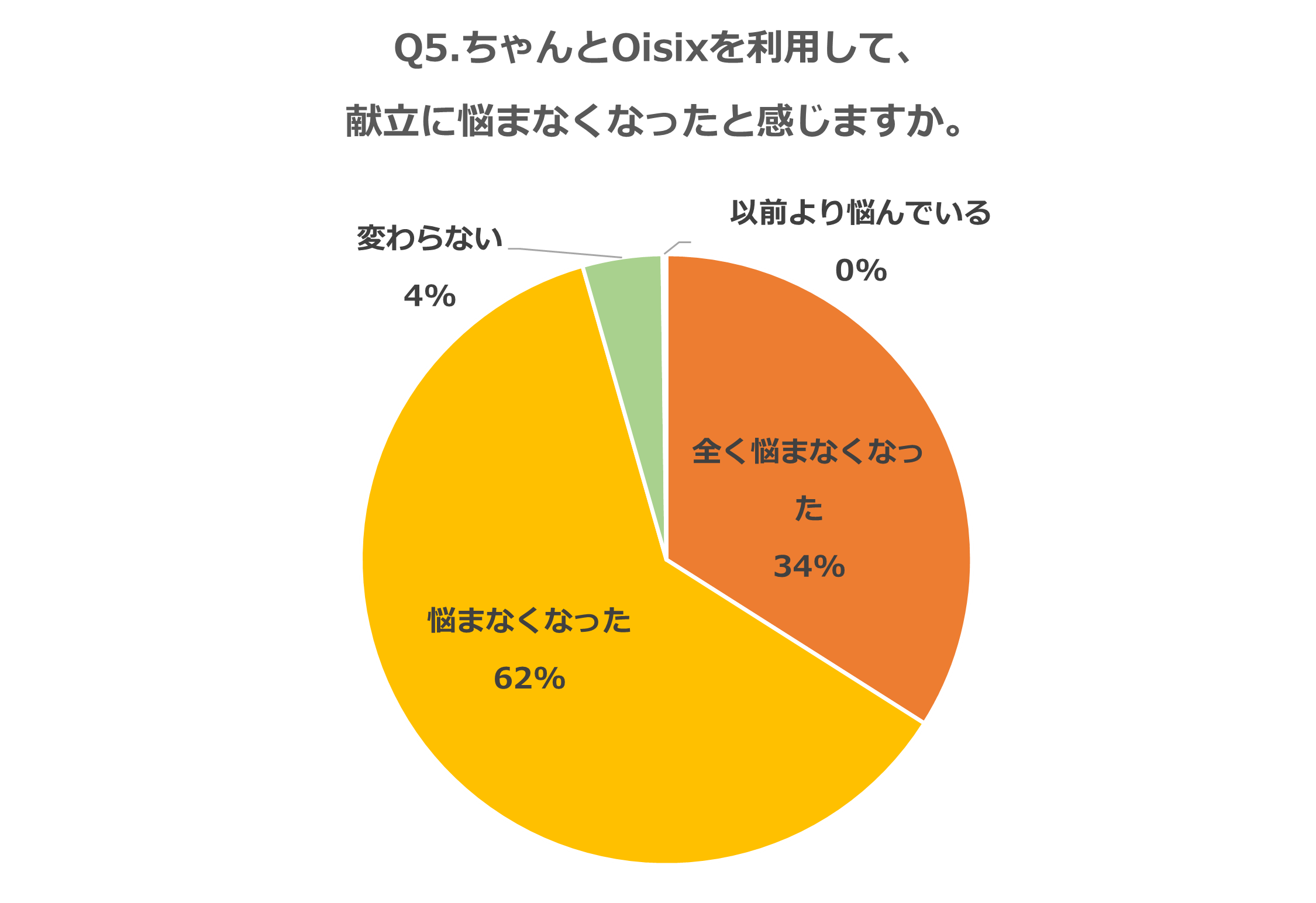 Oisixでは2013年7月に、共働き世帯の増加を受けて、主菜と副菜が20分で完成するミールキット「Kit Oisix」の販売を開始しました。その後、お客様には「時短したい」「献立を考えるのが手間」という時短ニーズに加えて「 “料理をしている実感”をもっと持ちたい」「料理は好きだけど食材のやりくりが苦手」というニーズもあることが分かったことから、時短をかなえながらもより調理の実感が持てるサービスとして、2019年10月に「ちゃんとOisix」を開始しました。野菜をふんだんに使ったバランスの良い献立と3日または5日分の食材・レシピがセットになって届くため、80%以上のお客様が「野菜摂取品目が増えている」(Q3)、「バランスのいい食事ができている」(Q4)、「献立に悩まなくなった」(Q5)と支持※。今後も、お客様の声を活かしたサービスを展開してまいります。
