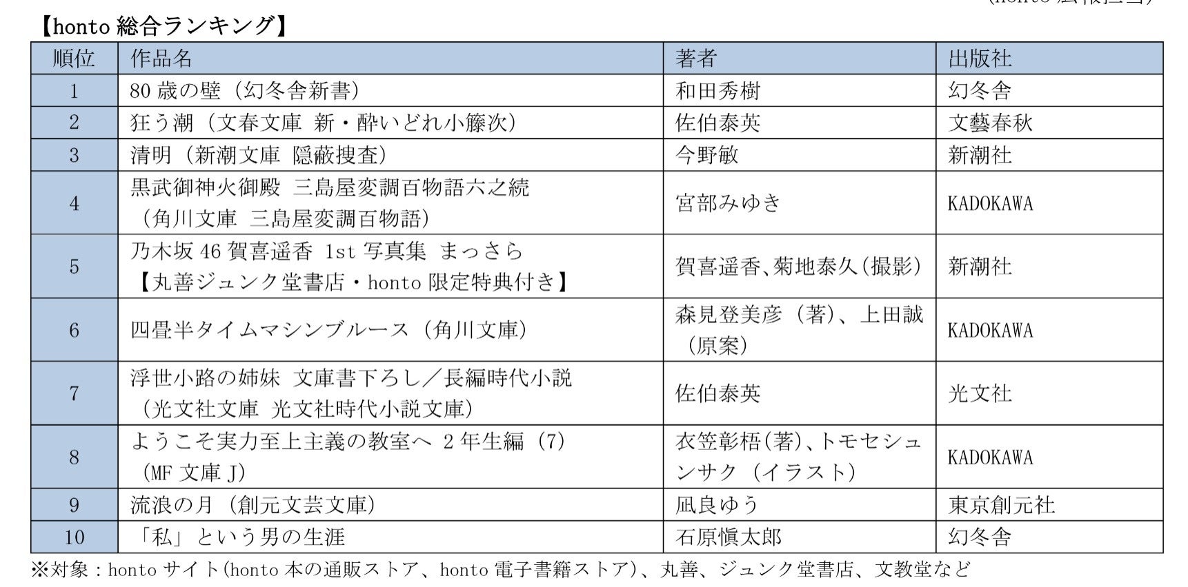 まず総合ランキングでは、先月から2か月連続で『80歳の壁(幻冬舎新書)』が第1位に輝きました。3月末に刊行された本書は5月に朝の情報番組で紹介されたことで人気が爆発しました。人生100年時代といわれて久しいですが、健康寿命の平均が男性72歳、女性75歳であることに着目し「80歳の壁」を超えて寿命を延ばす方法を論じています。hontoでは特にリアル書店での売上が好調です。