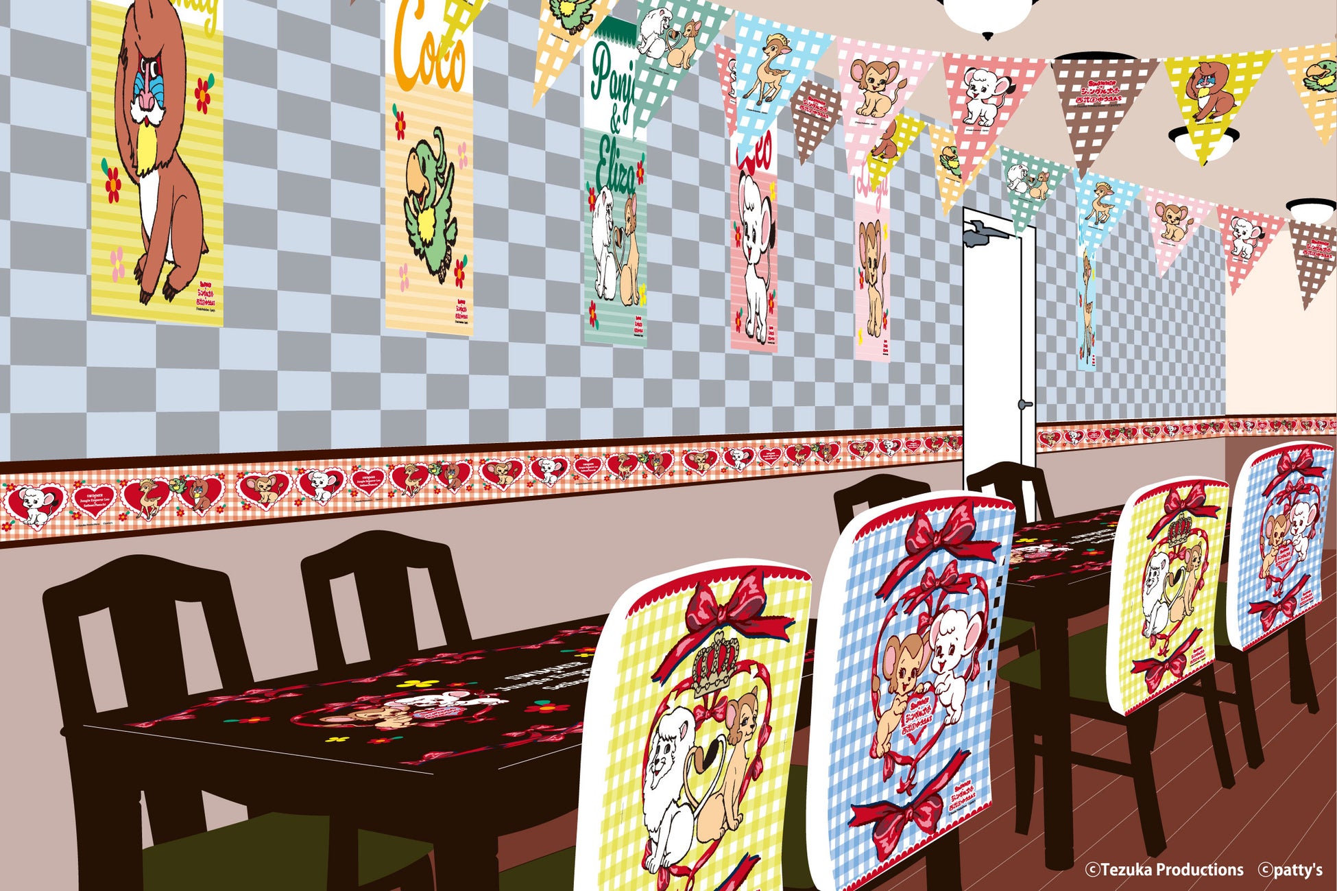 ギンガムチェックや赤いリボンを基調としたレトロでカラフルな装飾が、「軽食・売店 ミルクホール」にあふれます!テーブルの上から天井まで、目に入るもの全てが華やかでKawaii、SWIMMER×『ジャングル大帝』の世界に、胸がトキメキ、写真を撮らずにはいられません。ソフトクリイムソーダや揚げパンなど、誰からも愛される昭和の定番メニューも、レオとライヤとその仲間たちが集合したKawaiiデザインが施され、どれにしようか迷ってしまう愛らしさです。