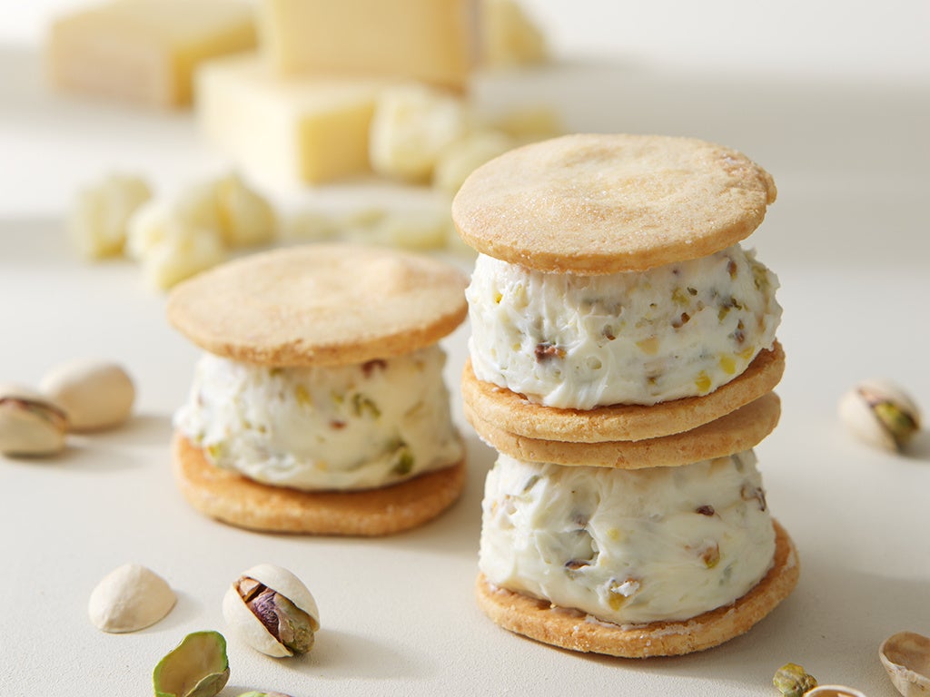 こだわりのクリームをサックリとしたビスキュイでサンドしたテイクアウトスイーツ。ゴーダチーズ、チェダーチーズ、マスカルポーネ、クリームチーズをブレンドしたレアチーズクリームにカシューナッツ、ピスタチオを加え、まったりとしたクリームに仕上げました。