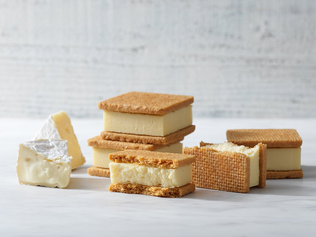 チーズケーキサンドに新しい味「カマンベール」が新登場。カマンベールベイクドチーズケーキをしっとりと したサブレでサンド。コクのあるチーズの味をおたのしみくだ さい!