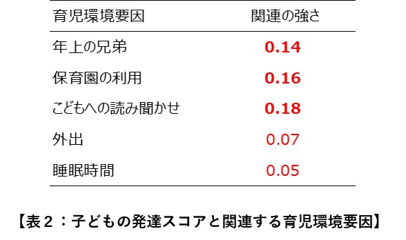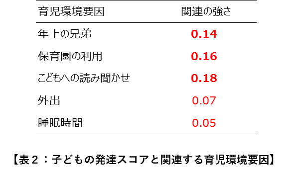 子どもの発達スコアを高くする育児環境要因として、年上の兄弟、保育園の利用、子どもへの読み聞かせが挙げられました。(表2)