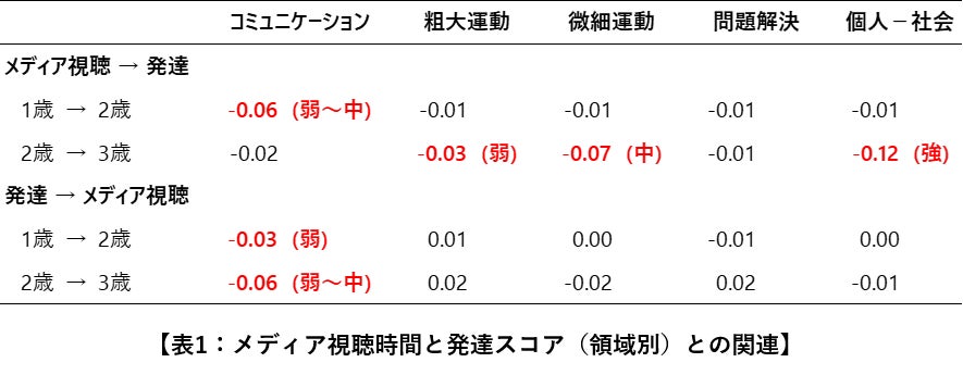 •発達領域(コミュニケーション、粗大運動、微細運動、問題解決、個人-社会)ごとに見ると、メディアの視聴時間が長くなると1歳から2歳ではコミュニケーション領域のみ、2歳から3歳では粗大運動、微細運動、個人-社会の3領域で発達スコアが低くなりました。(表1)