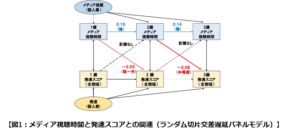 千葉大学予防医学センターの山本緑助教と、国立成育医療研究センターエコチル調査研究部の目澤秀俊チームリーダーらの研究グループは、テレビ・DVD視聴時間(メディア視聴時間)と発達について個人差を調整した上でも、乳幼児期のメディア視聴時間と子どもの発達が関連するかどうかを調査しました。(ランダム切片交差遅延パネルモデル(注1)にて検討)