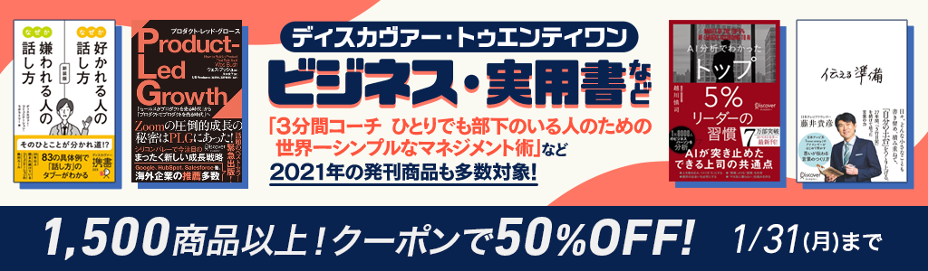 株式会社ディスカヴァー・トゥエンティワン(本社:東京都千代田区、取締役社長:谷口奈緒美)は2022年1月18日から1月31日の14日間、hontoにてディスカヴァーの電子書籍ほぼ全タイトル1516点が、クーポンで50%オフになる割引セールを開催します。