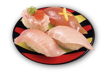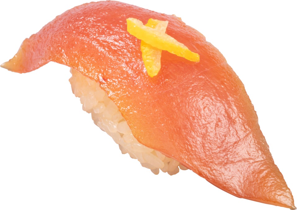 かっぱ寿司オリジナルのだし醤油に漬けた鮪に柚子をのせてさっぱりとした風味が楽しめます。