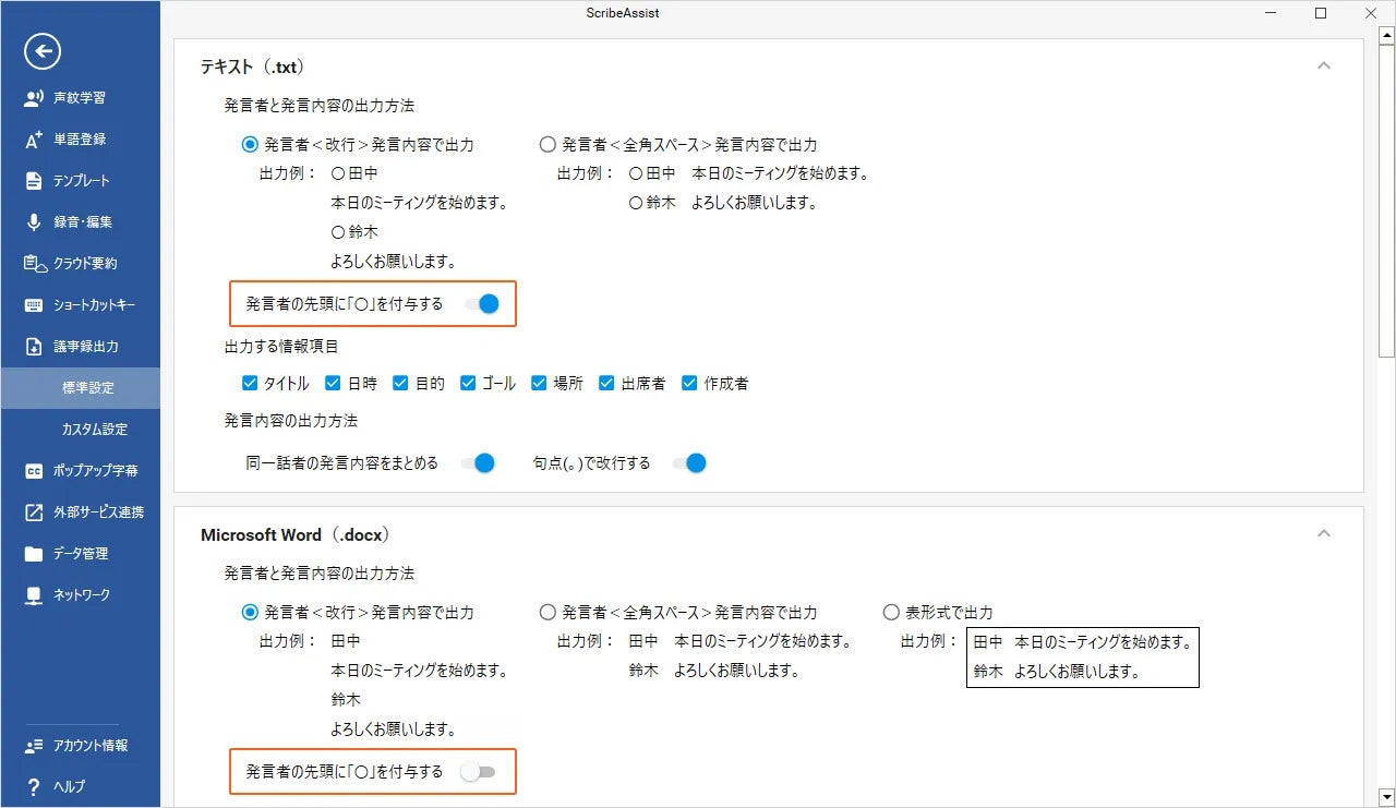 Microsoft Word(.docx)およびテキストファイル(.txt)出力時に、発言者名の先頭に挿入される「○」表記について設定画面のオン・オフ操作で、付与の有無を選択できるようになりました。