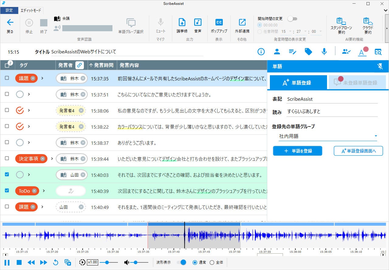 AI話者識別機能やキーワード・タグ付け機能、リアルタイム字幕表示機能、議事録作成に特化したファシリテーションモードなど、会議での運用に適した機能を多数搭載しています。